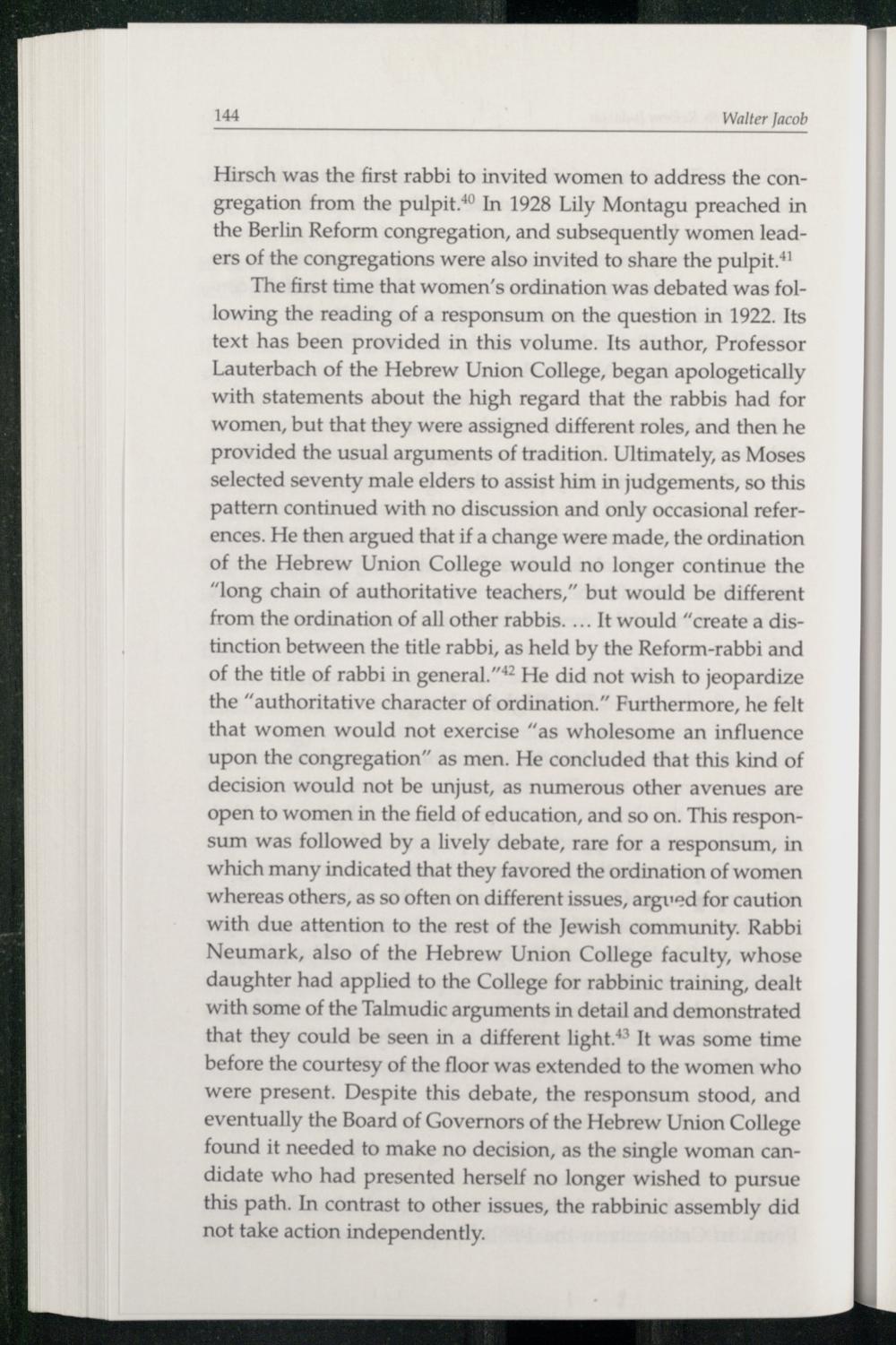 Hirsch was the first rabbi to invited women to address the congregation from the pulpit.*’ In 1928 Lily Montagu preached in the Berlin Reform congregation, and subsequently women leaders of the congregations were also invited to share the pulpit.*! The first time that women's ordination was debated was following the reading of a responsum on the question in 1922. Its text has been provided in this volume. Its author, Professor Lauterbach of the Hebrew Union College , began apologetically with statements about the high regard that the rabbis had for women, but that they were assigned different roles, and then he provided the usual arguments of tradition. Ultimately, as Moses selected seventy male elders to assist him in judgements, so this pattern continued with no discussion and only occasional references. He then argued that if a change were made, the ordination of the Hebrew Union College would no longer continue the “long chain of authoritative teachers,” but would be different from the ordination of all other rabbis.... It would“create a distinction between the title rabbi, as held by the Reform-rabbi and of the title of rabbi in general.”*> He did not wish to jeopardize the“authoritative character of ordination.” Furthermore, he felt ‘as wholesome an influence