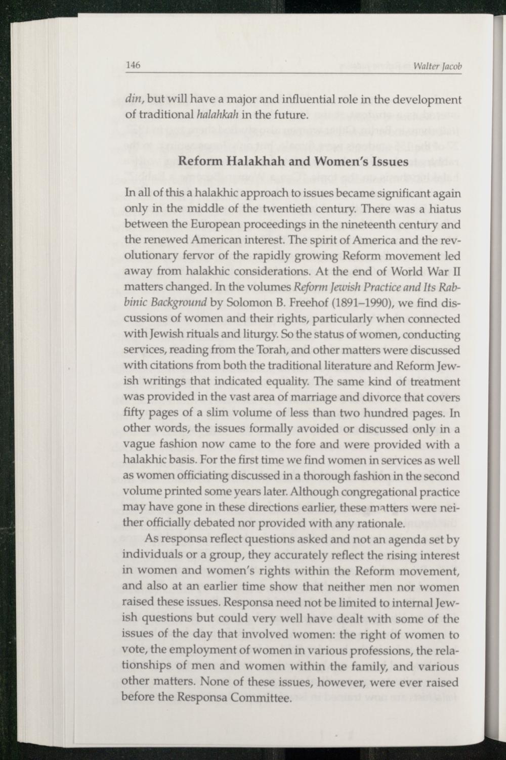 In all of this a halakhic approach to issues became significant again only in the middle of the twentieth century. There was a hiatus between the European proceedings in the nineteenth century and the renewed American interest. The spirit of America and the revolutionary fervor of the rapidly growing Reform movement led away from halakhic considerations. At the end of World War II matters changed. In the volumes Reform Jewish Practice and Its Rabbinic Background by Solomon B. Freehof (1891-1990), we find discussions of women and their rights, particularly when connected with Jewish rituals and liturgy. So the status of women, conducting services, reading from the Torah , and other matters were discussed with citations from both the traditional literature and Reform Jewish writings that indicated equality. The same kind of treatment was provided in the vast area of marriage and divorce that covers fifty pages of a slim volume of less than two hundred pages. In other words, the issues formally avoided or discussed only in a vague fashion now came to the fore and were provided with a halakhic basis. For the first time we find women in services as well as women officiating discussed in a thorough fashion in the second volume printed some years later. Although congregational practice may have gone in these directions earlier, these matters were neither officially debated nor provided with any rationale.