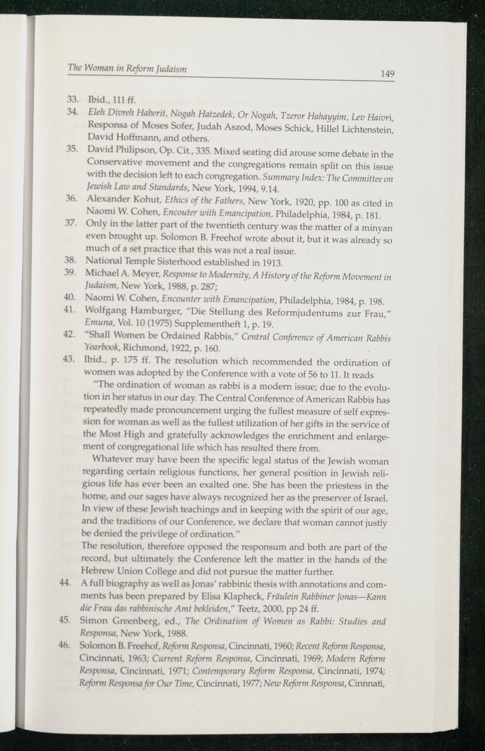 Naomi W. Cohen, Encounter with F mancipation, Philadelphia , 1984, p. 198. Wolfgang Hamburger,“Die Stellung des Reformjudentums zur Frau,” Emuna, Vol. 10(1975) Supplementheft 1, p-19.