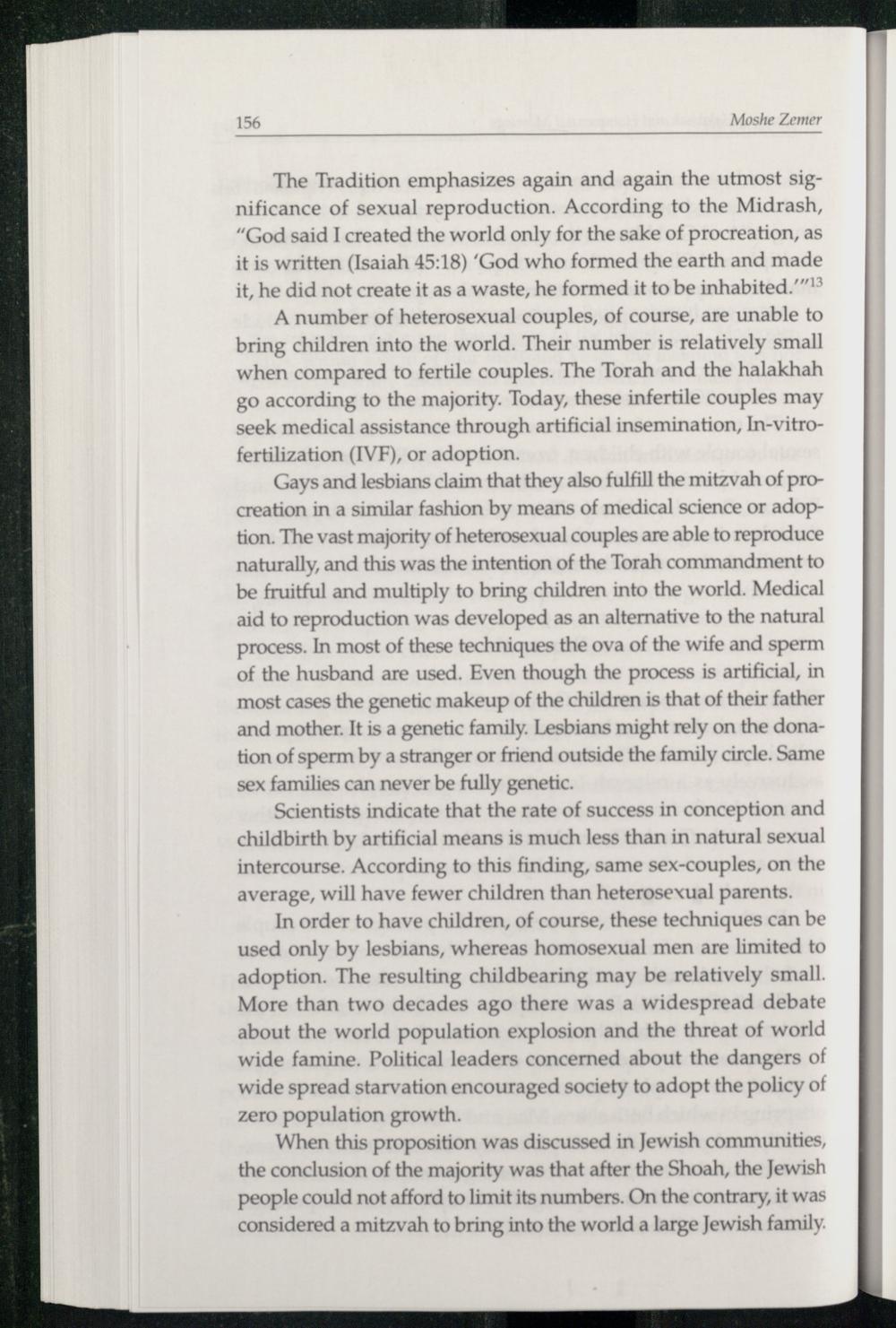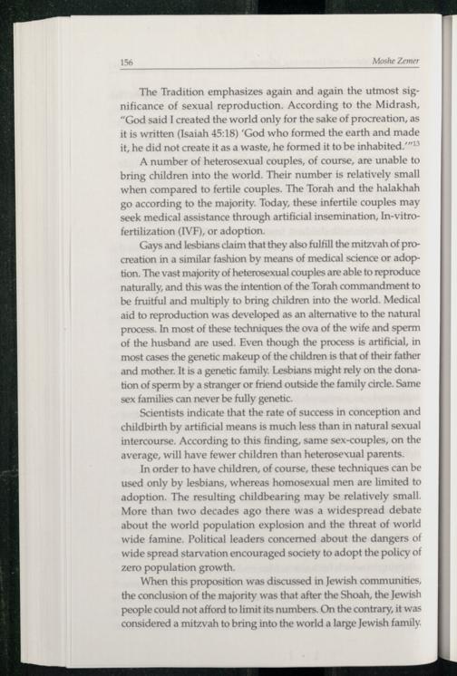 Gays and lesbians claim that they also fulfill the mitzvah of procreation in a similar fashion by means of medical science or adoption. The vast majority of heterosexual couples are able to reproduce naturally, and this was the intention of the Torah commandment to be fruitful and multiply to bring children into the world. Medical aid to reproduction was developed as an alternative to the natural process. In most of these techniques the ova of the wife and sperm of the husband are used. Even though the process is artificial, in most cases the genetic makeup of the children is that of their father and mother. It is a genetic family. Lesbians might rely on the donation of sperm by a stranger or friend outside the family circle. Same sex families can never be fully genetic.