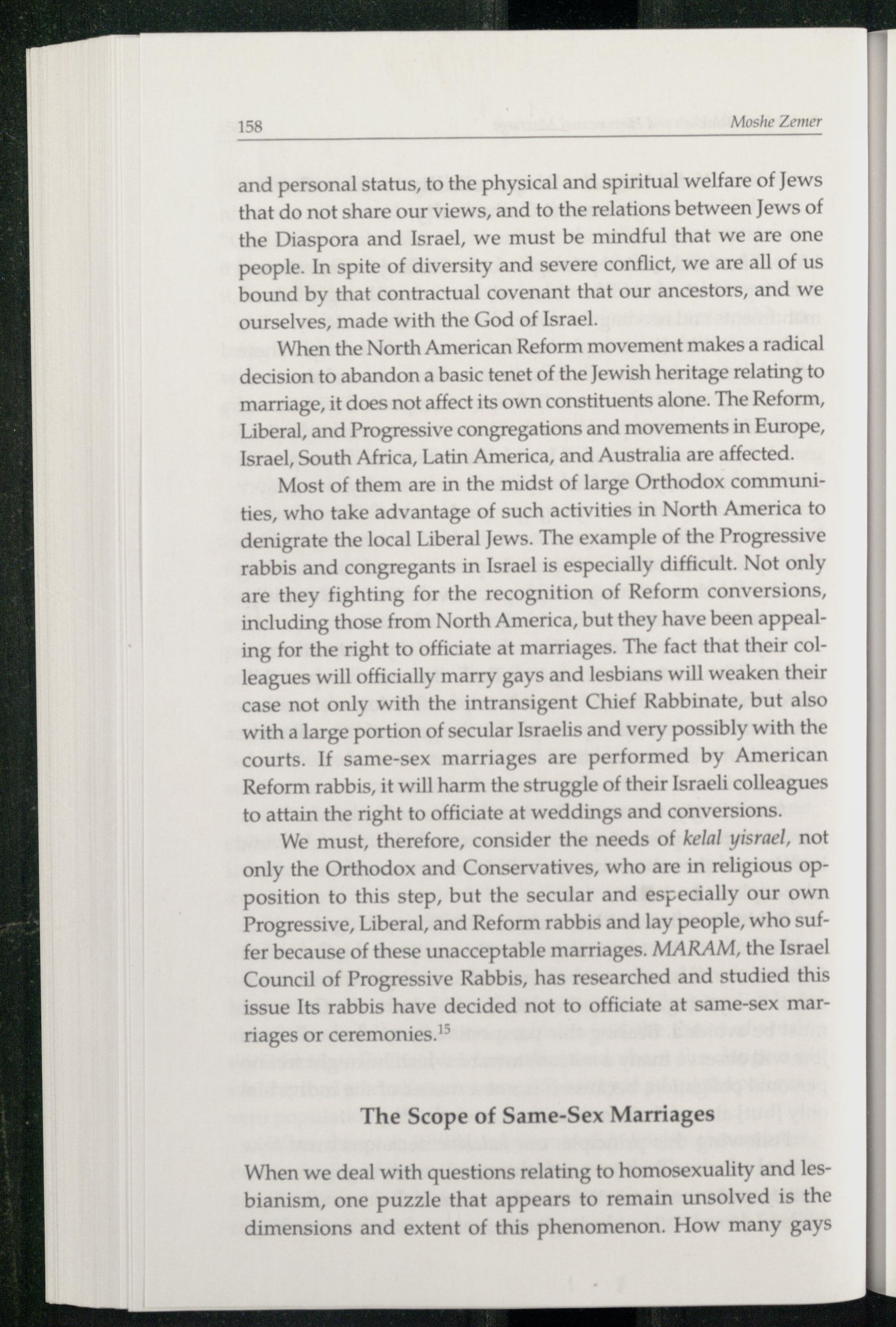 We must, therefore, consider the needs of kelal yisrael, not only the Orthodox and Conservatives, who are in religious opposition to this step, but the secular and especially our own Progressive, Liberal, and Reform rabbis and lay people, who suffer because of these unacceptable marriages. MARAM, the Israel Council of Progressive Rabbis, has researched and studied this issue Its rabbis have decided not to officiate at same-sex mar