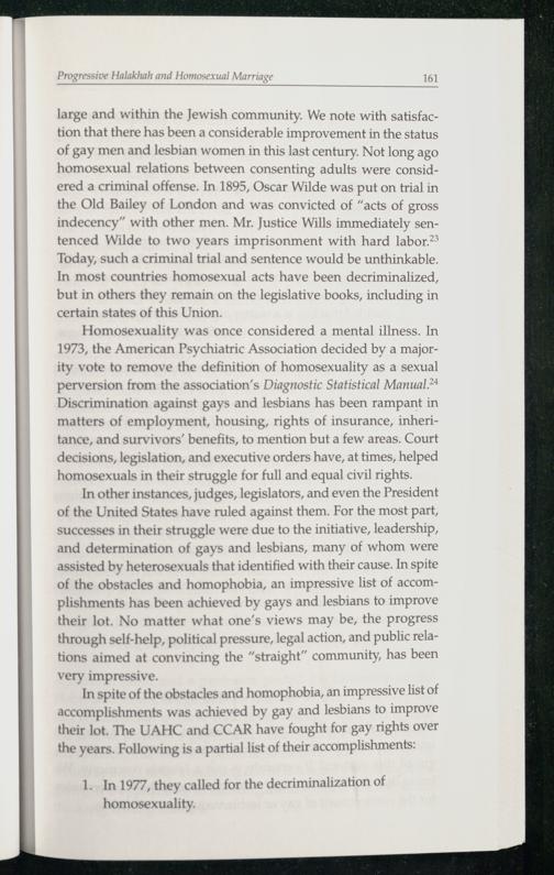 large and within the Jewish community. We note with satisfaction that there has been a considerable improvement in the status of gay men and lesbian women in this last century. Not long ago homosexual relations between consenting adults were considered a criminal offense. In 1895, Oscar Wilde was put on trial in the Old Bailey of London and was convicted of“acts of gross indecency” with other men. Mr. Justice Wills immediately sentenced Wilde to two years imprisonment with hard labor.?? Today, such a criminal trial and sentence would be unthinkable. In most countries homosexual acts have been decriminalized, but in others they remain on the legislative books, including in certain states of this Union.