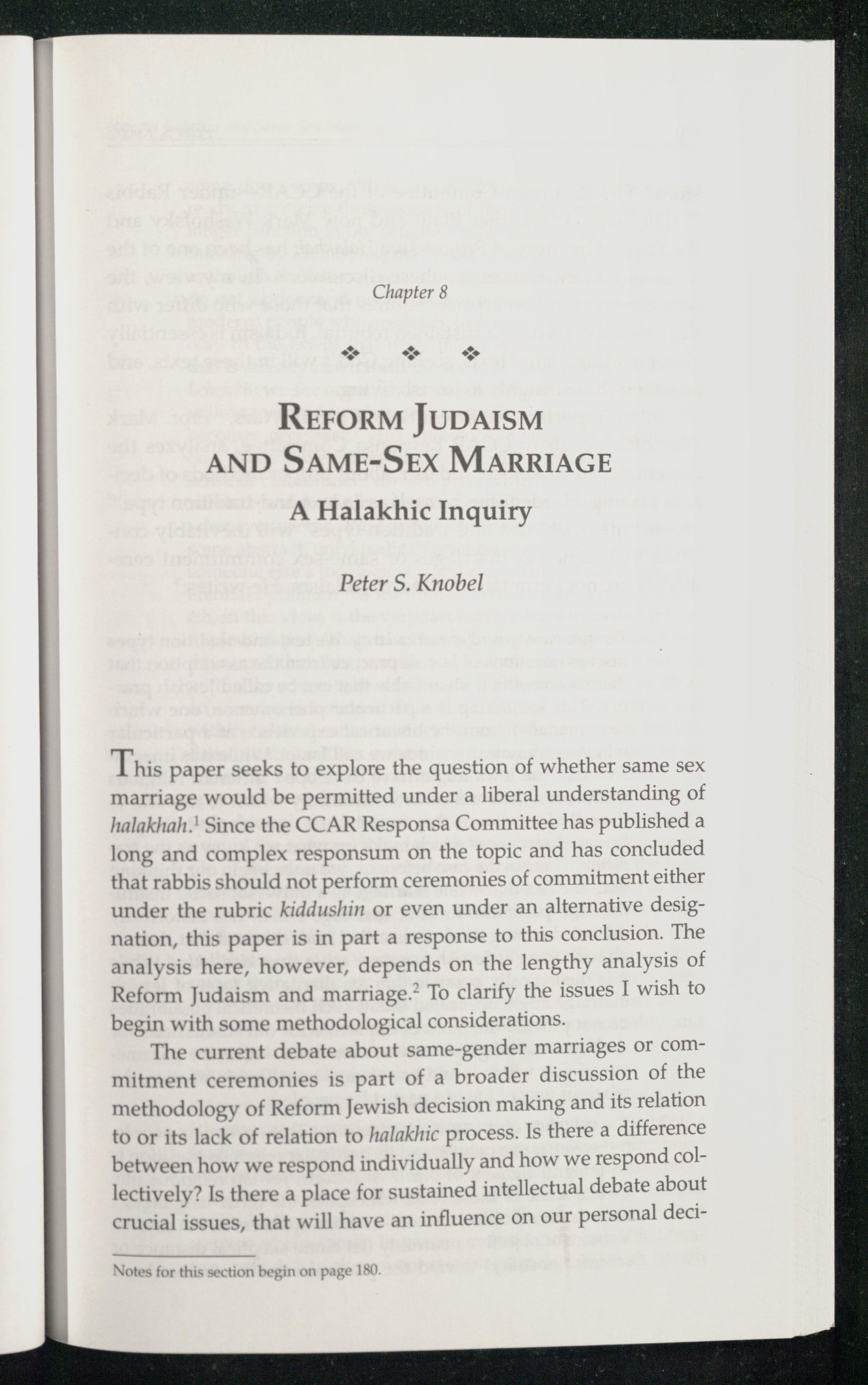 This paper seeks to explore the question of whether same sex marriage would be permitted under a liberal understanding of halakhah.! Since the CCAR Responsa Committee has published a long and complex responsum on the topic and has concluded that rabbis should not perform ceremonies of commitment either under the rubric kiddushin or even under an alternative designation, this paper is in part a response to this conclusion. The analysis here, however, depends on the lengthy analysis of Reform Judaism and marriage.” To clarify the issues I wish to begin with some methodological considerations.
