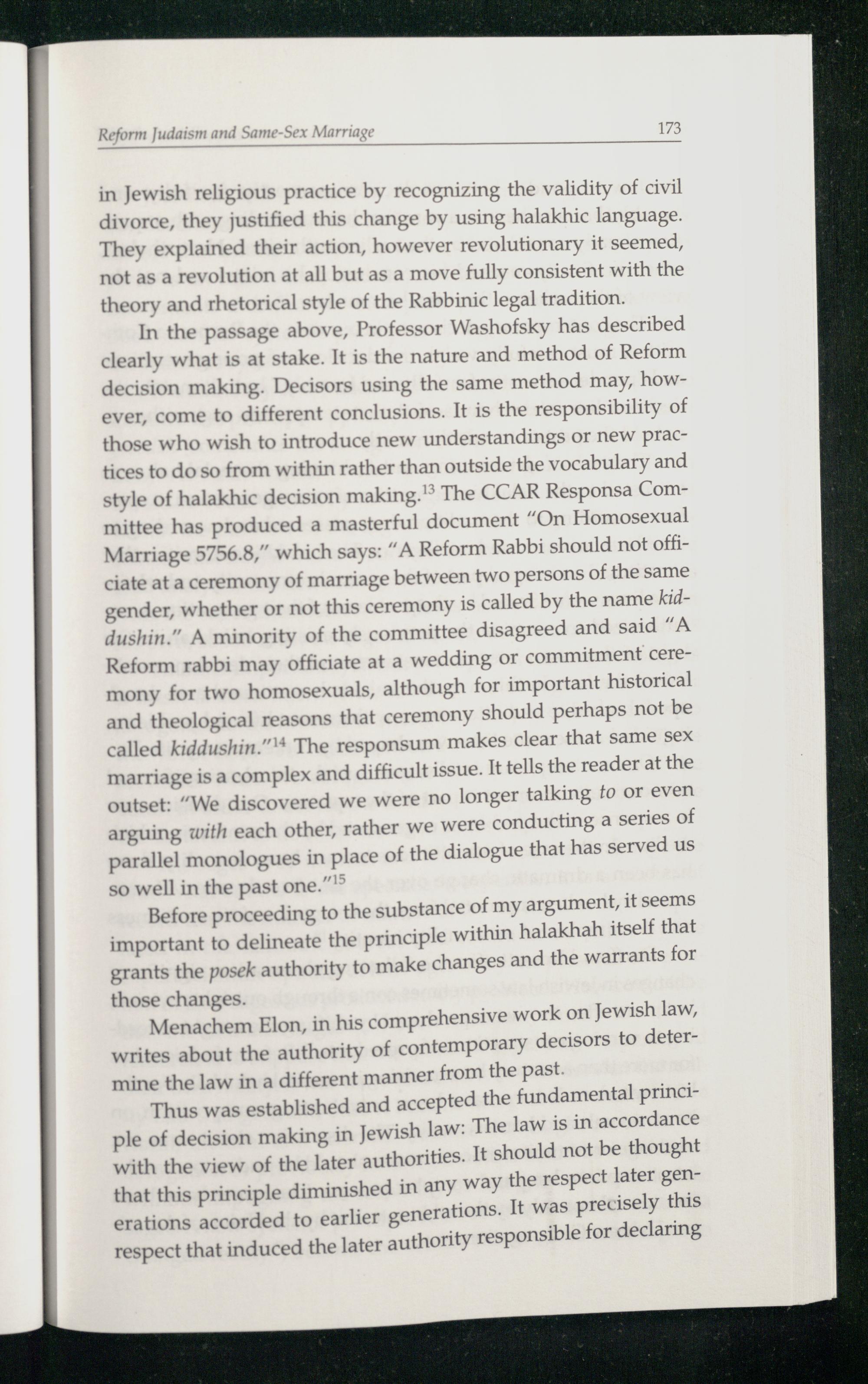 In the passage above, Professor Washofsky has described clearly what is at stake. It is the nature and method of Reform decision making. Decisors using the same method may, however, come to different conclusions. It is the responsibility of those who wish to introduce new understandings or new practices to do so from within rather than outside the vocabulary and style of halakhic decision making. The CCAR Responsa Committee has produced a masterful document“On Homosexual Marriage 5756.8,” which says:“ A Reform Rabbi should not officiate at a ceremony of marriage between two persons of the same gender, whether or not this ceremony is called by the name kiddushin.” A minority of the committee disagreed and said“A Reform rabbi may officiate at a wedding or commitment ceremony for two homosexuals, although for important historical and theological reasons that ceremony should perhaps not be called kiddushin.”"* The responsum makes clear that same sex marriage is a complex and difficult issue. It tells the reader at the outset:“We discovered we were No longer talking to or even arguing with each other, rather we were conducting a series of parallel monologues in place of the dialogue that has served us so well in the past one.”"