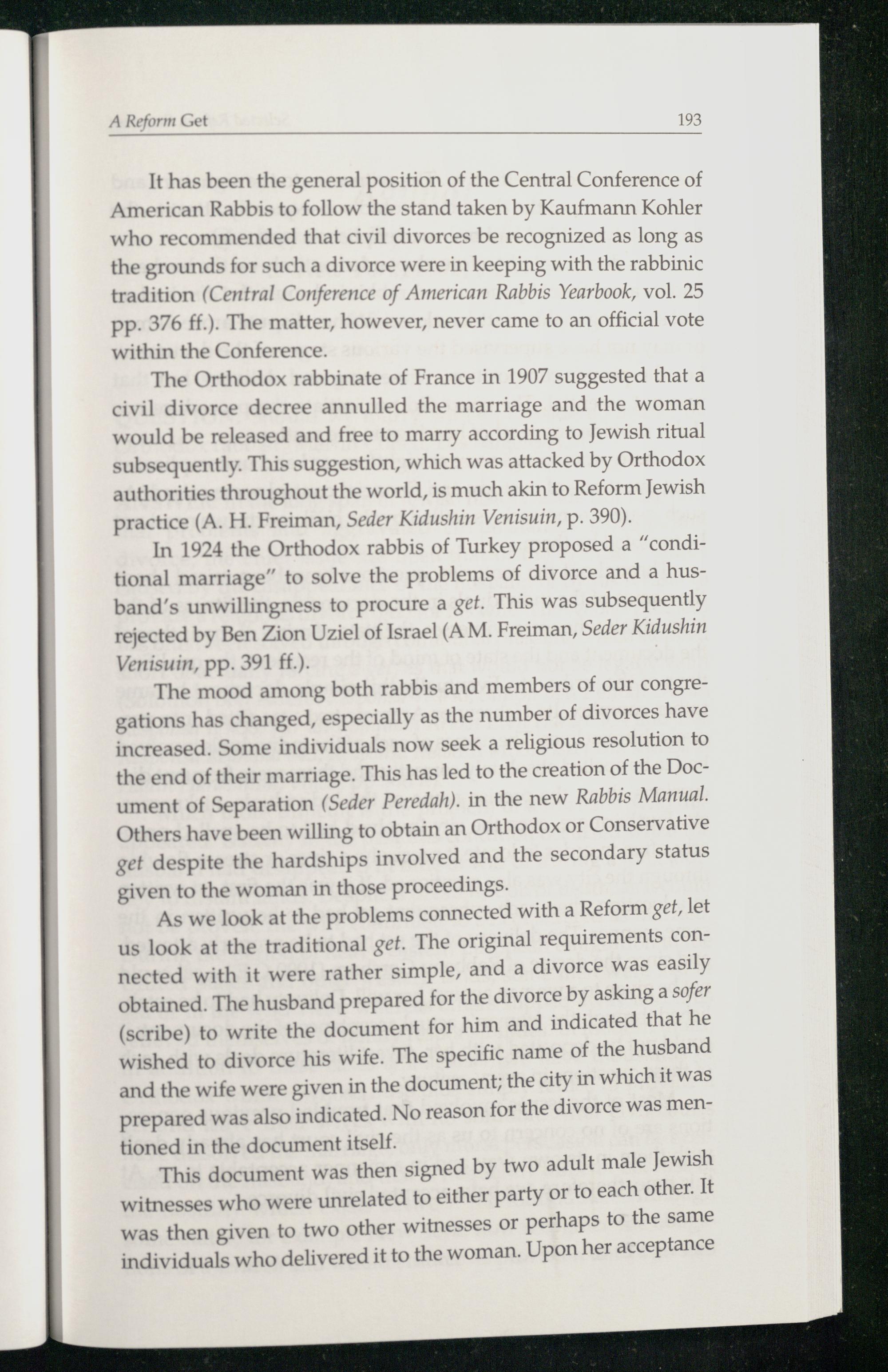 As we look at the problems connected with a Reform get, let us look at the traditional get. The original requirements connected with it were rather simple, and a divorce was easily obtained. The husband prepared for the divorce by asking a sofer (scribe) to write the document for him and indicated that he wished to divorce his wife. The specific name of the husband and the wife were given in the document; the city in which it was prepared was also indicated. No reason for the divorce was men