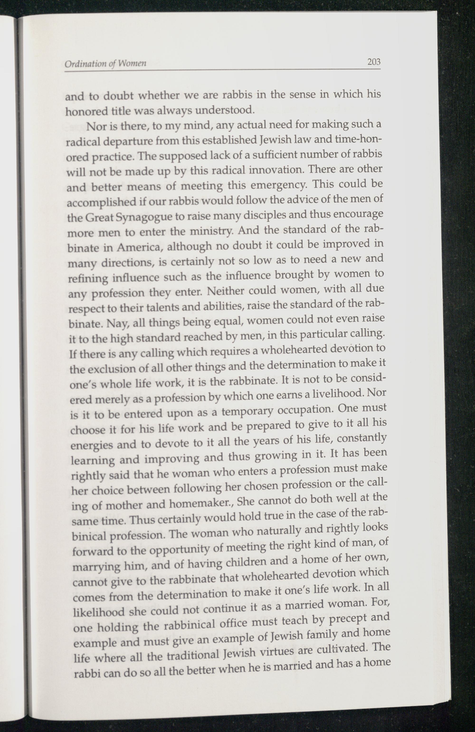 Nor is there, to my mind, any actual need for making such a radical departure from this established Jewish law and time-honored practice. The supposed lack of a sufficient number of rabbis will not be made up by this radical innovation. There are other and better means of meeting this emergency. This could be accomplished if our rabbis would follow the advice of the men of the Great Synagogue to raise many disciples and thus encourage more men to enter the ministry. And the standard of the rabbinate in America, although no doubt it could be improved in many directions, is certainly not so low as to need a new and refining influence such as the influence brought by women to any profession they enter. Neither could women, with all due respect to their talents and abilities, raise the standard of the rabbinate. Nay, all things being equal, women could not even raise it to the high standard reached by men, in this particular calling. If there is any calling which requires a wholehearted devotion to the exclusion of all other things and the determination to make it one’s whole life work, it is the rabbinate. It is not to be considered merely as a profession by which one earns a livelihood. Nor is it to be entered upon as a temporary occupation. One must choose it for his life work and be prepared to give to it all his energies and to devote to it all the years of his life, constantly learning and improving and thus growing in it. It has been rightly said that he woman who enters a profession must make her choice between following her chosen profession or the calling of mother and homemaker., She cannot do both well at the same time. Thus certainly would hold true in the case of the rabbinical profession. The woman who naturally and rightly looks forward to the opportunity of meeting the right kind of man, of marrying him, and of having children and a home of her own, cannot give to the rabbinate that wholehearted devotion which comes from the determination to make it one’s life work. In all