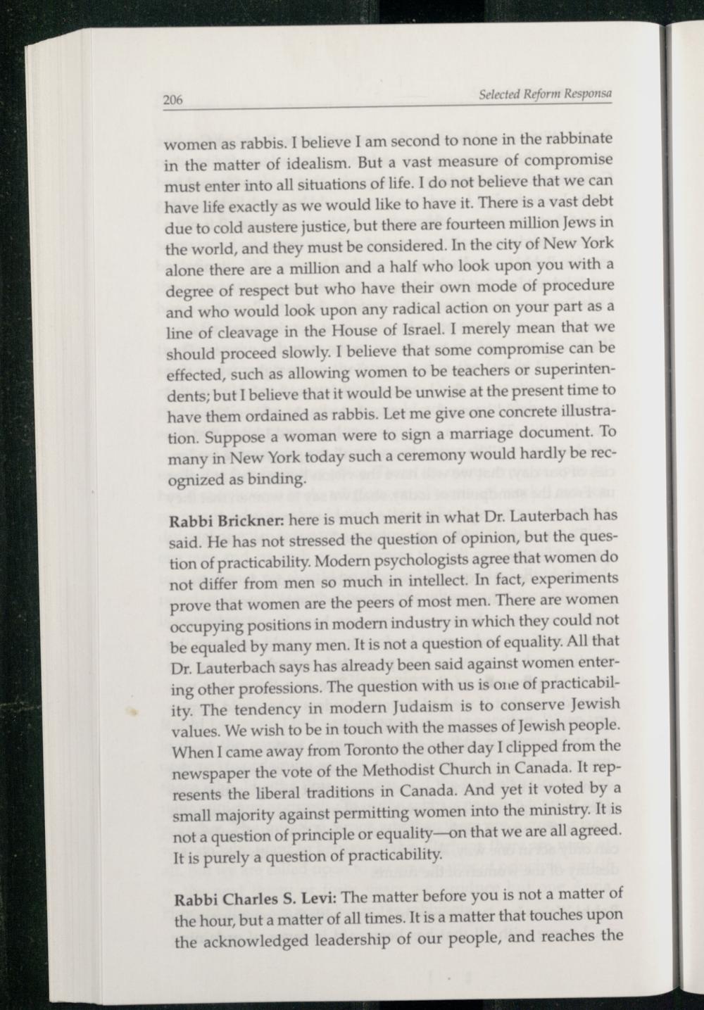 women as rabbis. I believe I am second to none in the rabbinate in the matter of idealism. But a vast measure of compromise must enter into all situations of life. I do not believe that we can have life exactly as we would like to have it. There is a vast debt due to cold austere justice, but there are fourteen million Jews in the world, and they must be considered. In the city of New York alone there are a million and a half who look upon you with a degree of respect but who have their own mode of procedure and who would look upon any radical action on your part as a line of cleavage in the House of Israel. I merely mean that we should proceed slowly. I believe that some compromise can be effected, such as allowing women to be teachers or superintendents: but I believe that it would be unwise at the present time to have them ordained as rabbis. Let me give one concrete illustration. Suppose a woman were to sign a marriage document. To many in New York today such a ceremony would hardly be rec