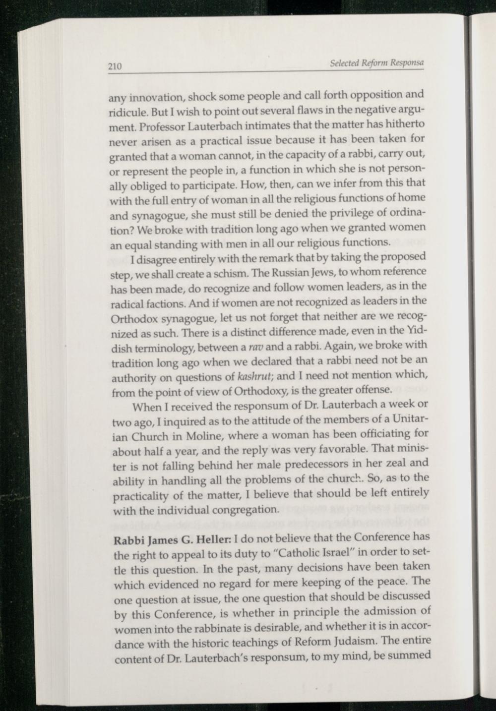 by this Conference, is whether in principle the admission of women into the rabbinate is desirable, and whether it is in accordance with the historic teachings of Reform Judaism. The entire content of Dr. Lauterbach’s responsum, to my mind, be summed