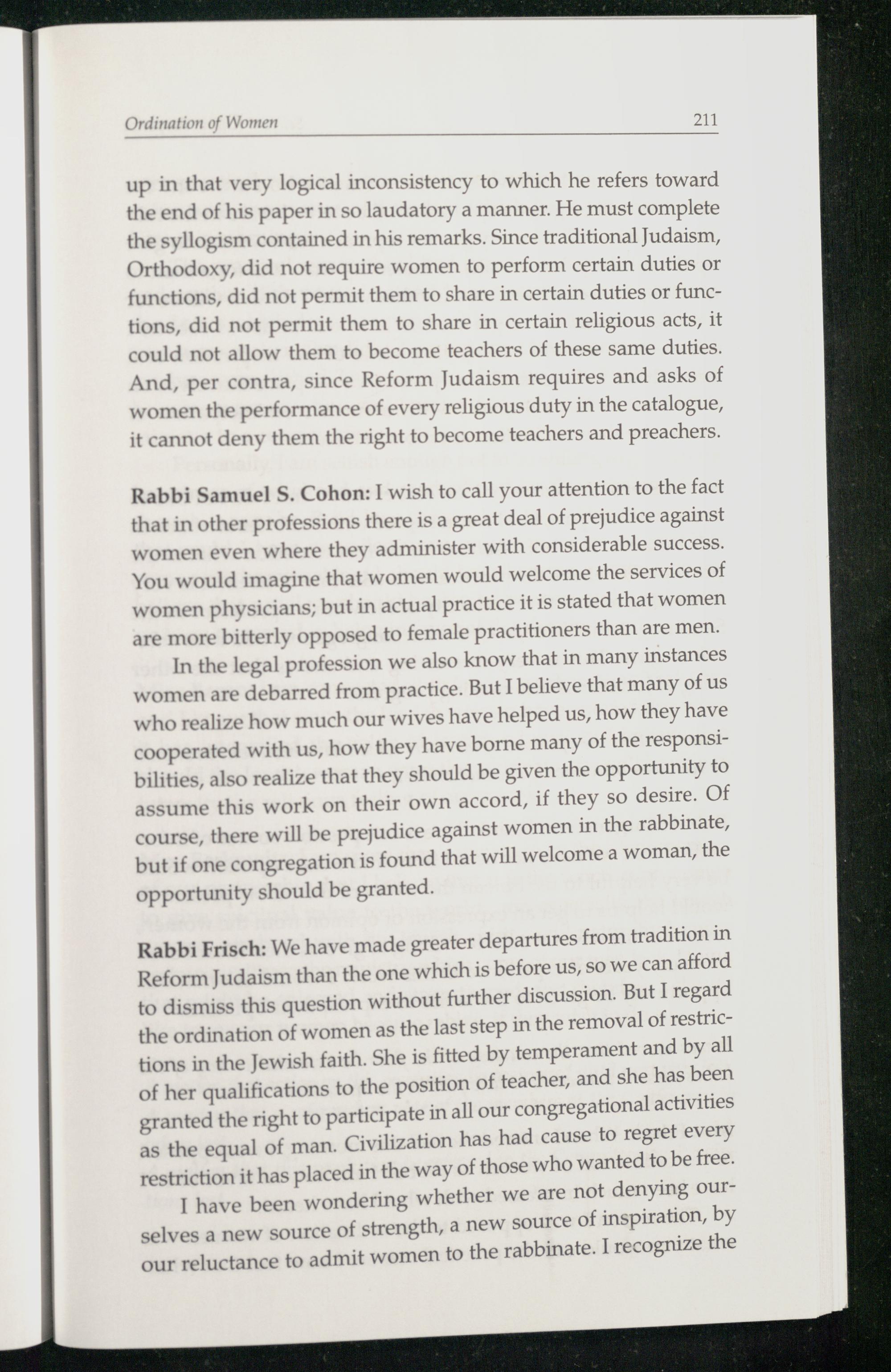 Rabbi Frisch: We have made greater departures from tradition in Reform Judaism than the one which is before us, so we can afford to dismiss this question without further discussion. But I regard the ordination of women as the last step in the removal of restrictions in the Jewish faith. She is fitted by temperament and by all of her qualifications to the position of teacher, and she has been granted the right to participate in all our congregational activities as the equal of man. Civilization has had cause to regret every restriction it has placed in the way of those who wanted to be free.
