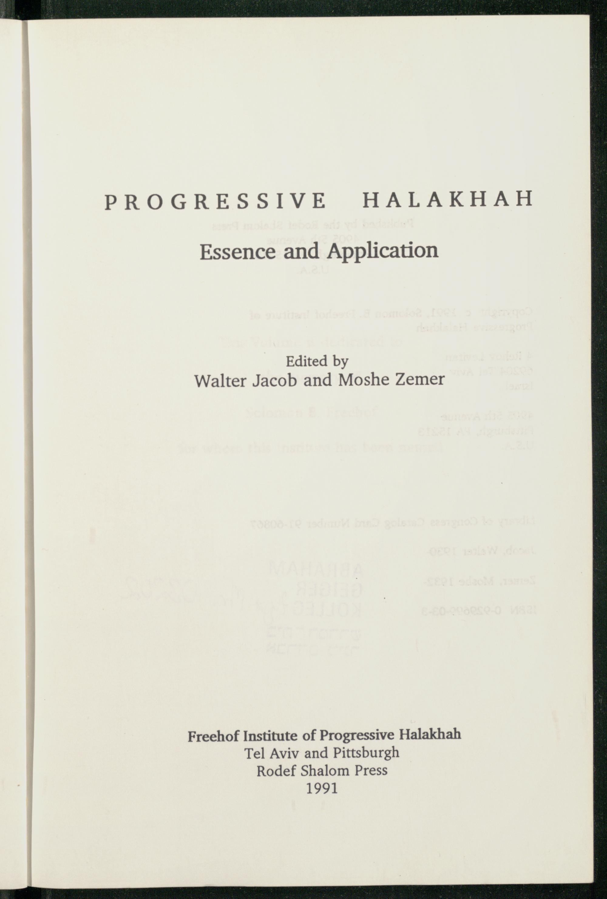 PROGRESSIVE HALAKHAHH Essence and Application Edited by Walter Jacob and Moshe Zemer Freehof Institute of Progressive Halakhah Tel Aviv and Pittsburgh Rodef Shalom Press 1991