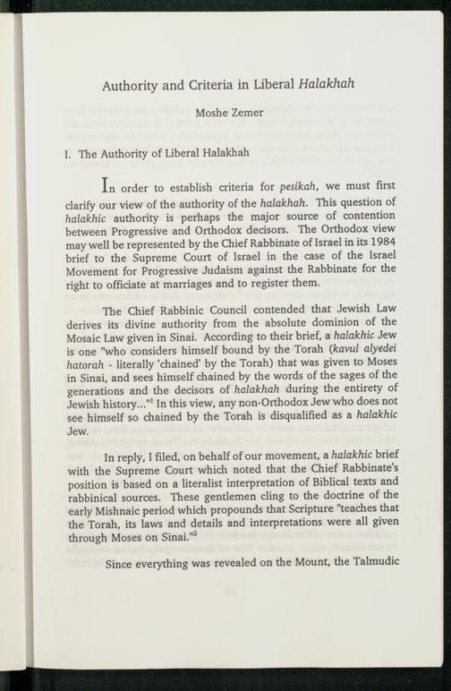 clarify our view of the authority of the halakhah. This question of halakhic authority is perhaps the major source of contention between Progressive and Orthodox decisors. The Orthodox view may well be represented by the Chief Rabbinate of Israel in its 1984 brief to the Supreme Court of Israel in the case of the Israel Movement for Progressive Judaism against the Rabbinate for the right to officiate at marriages and to register them.