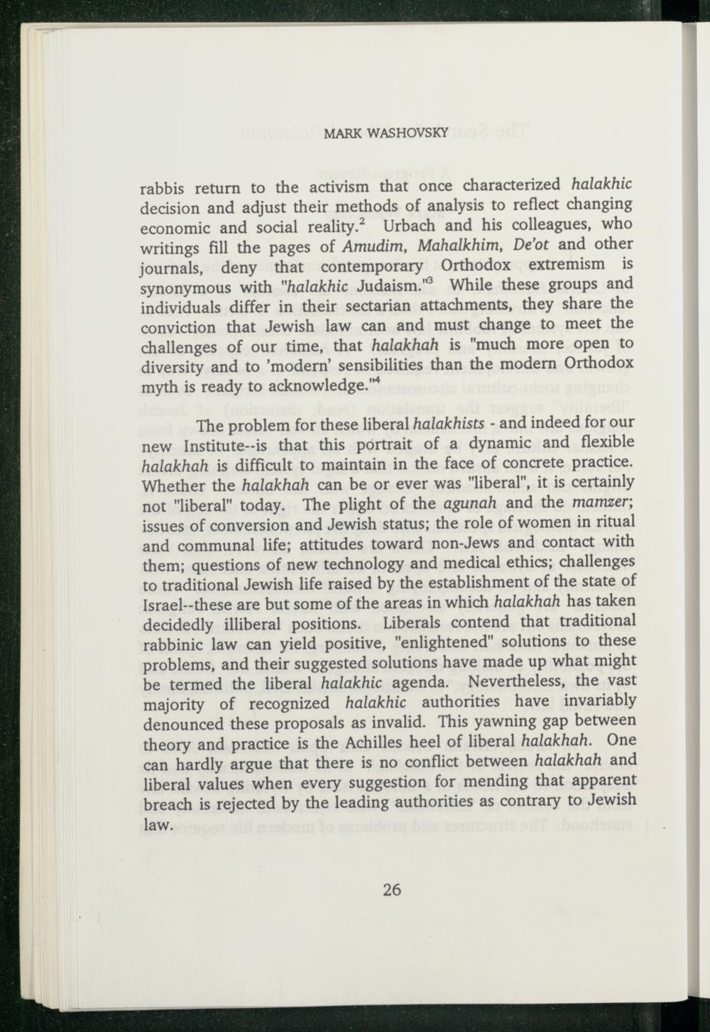 rabbis return to the activism that once characterized halakhic decision and adjust their methods of analysis to reflect changing economic and social reality. Urbach and his colleagues, who writings fill the pages of Amudim, Mahalkhim, De'ot and other journals, deny that contemporary Orthodox extremism is synonymous with"halakhic Judaism .” While these groups and individuals differ in their sectarian attachments, they share the conviction that Jewish law can and must change to meet the challenges of our time, that halakhah is"much more open to diversity and to‘modern’ sensibilities than the modern Orthodox myth is ready to acknowledge."