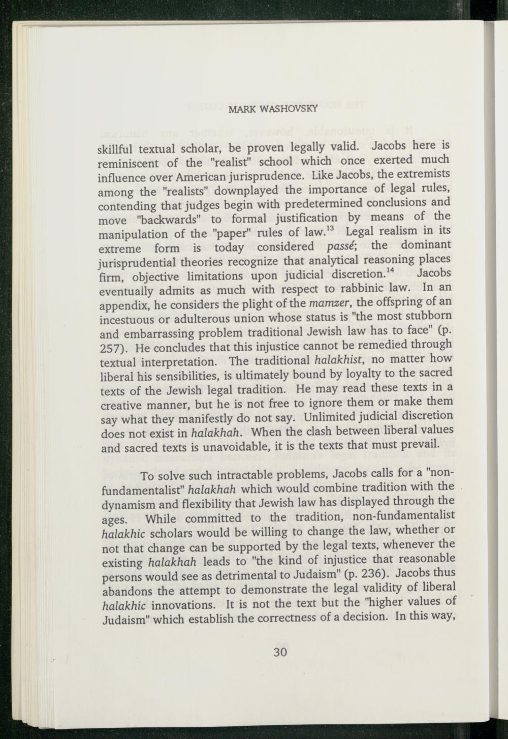 skillful textual scholar, be proven legally valid. Jacobs here is reminiscent of the"realist" school which once exerted much influence over American jurisprudence. Like Jacobs, the extremists among the"realists" downplayed the importance of legal rules, contending that judges begin with predetermined conclusions and move"backwards" to formal justification by means of the manipulation of the"paper" rules of law.” Legal realism in its extreme form is today considered passé; the dominant jurisprudential theories recognize that analytical reasoning places firm, objective limitations upon judicial discretion.™ Jacobs eventuaily admits as much with respect to rabbinic law. In an appendix, he considers the plight of the mamzer, the offspring of an incestuous or adulterous union whose status is"the most stubborn and embarrassing problem traditional Jewish law has to face"(p. 257). He concludes that this injustice cannot be remedied through textual interpretation. The traditional halakhist, no matter how liberal his sensibilities, is ultimately bound by loyalty to the sacred texts of the Jewish legal tradition. He may read these texts in a creative manner, but he is not free to ignore them or make them say what they manifestly do not say. Unlimited judicial discretion does not exist in halakhah. When the clash between liberal values and sacred texts is unavoidable, it is the texts that must prevail.