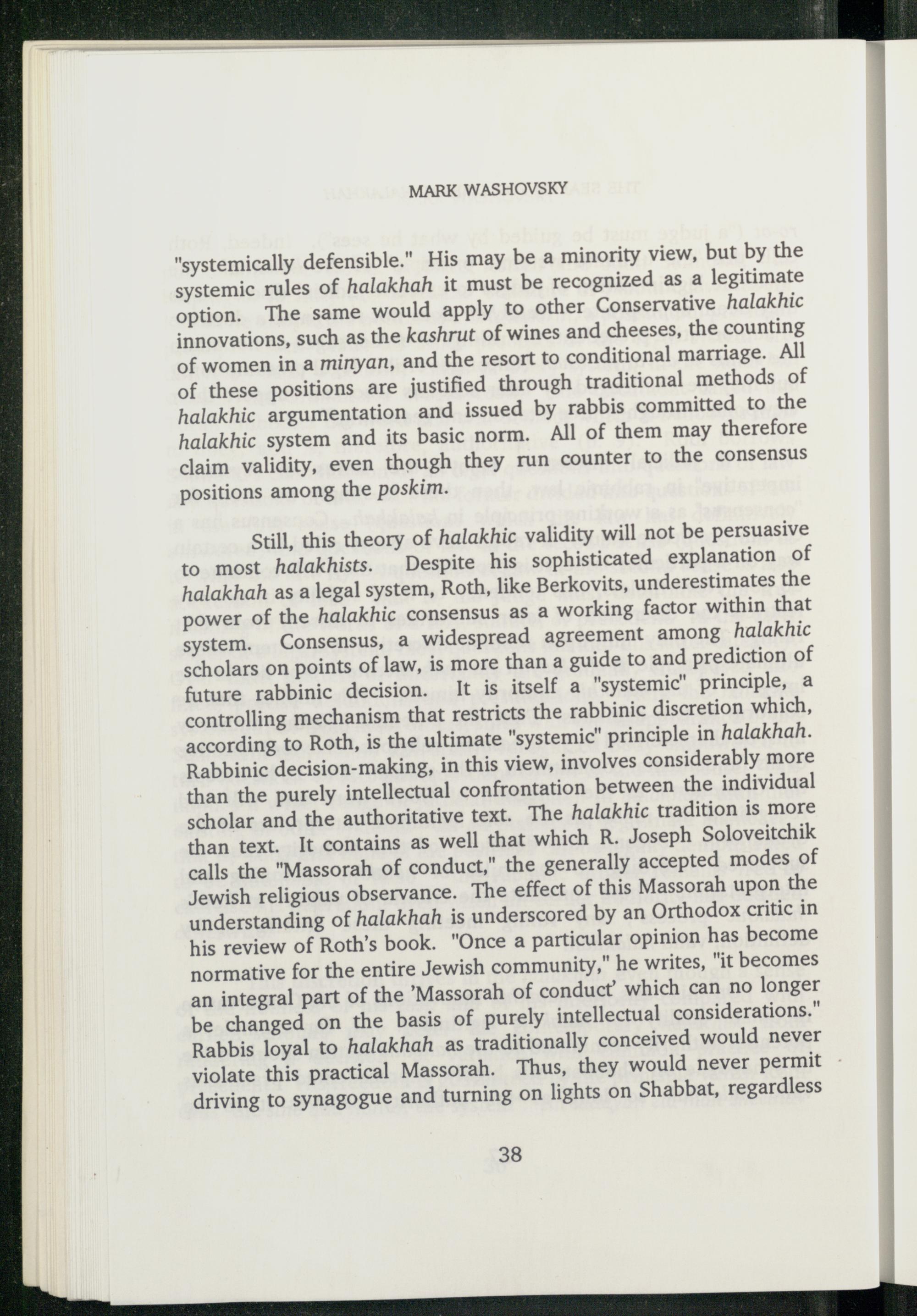 to most halakhists. Despite his sophisticated explanation of halakhah as a legal system, Roth, like Berkovits, underestimates the power of the halakhic consensus as a working factor within that system. Consensus, a widespread agreement among halakhic scholars on points of law, is more than a guide to and prediction of future rabbinic decision. It is itself a"systemic" principle, a controlling mechanism that restricts the rabbinic discretion which, according to Roth, is the ultimate"systemic" principle in halakhah. Rabbinic decision-making, in this view, involves considerably more than the purely intellectual confrontation between the individual scholar and the authoritative text. The halakhic tradition is more than text. It contains as well that which R. Joseph Soloveitchik calls the"Massorah of conduct," the generally accepted modes of Jewish religious observance. The effect of this Massorah upon the understanding of halakhah is underscored by an Orthodox critic in his review of Roth’s book."Once a particular opinion has become normative for the entire Jewish community," he writes,"it becomes an integral part of the'Massorah of conduct’ which can no longer be changed on the basis of purely intellectual considerations." Rabbis loyal to halakhah as traditionally conceived would never violate this practical Massorah. Thus, they would never permit driving to synagogue and turning on lights on Shabbat , regardless