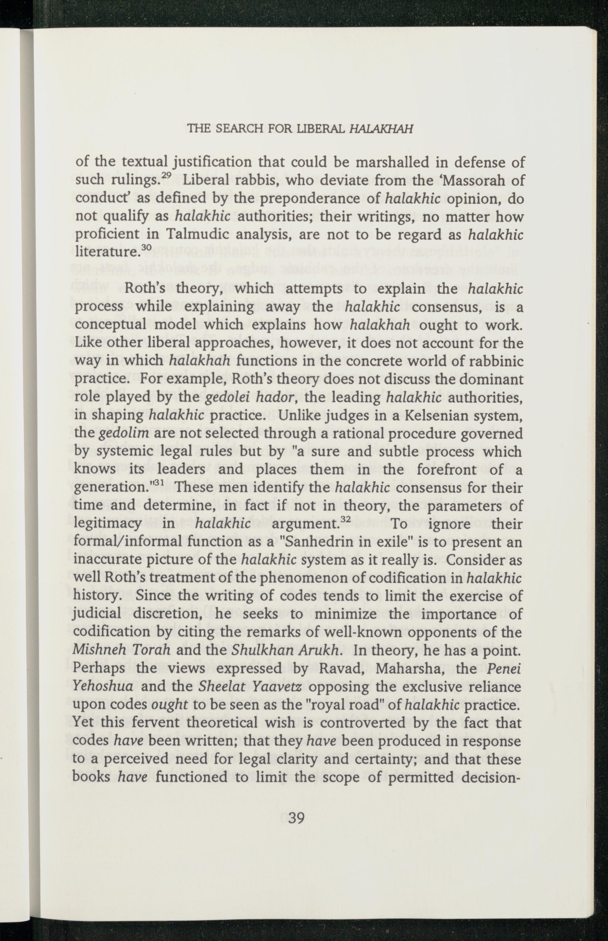 Roth’s theory, which attempts to explain the halakhic process while explaining away the halakhic consensus, is a conceptual model which explains how halakhah ought to work. Like other liberal approaches, however, it does not account for the way in which halakhah functions in the concrete world of rabbinic practice. For example, Roth’s theory does not discuss the dominant role played by the gedolei hador, the leading halakhic authorities, in shaping halakhic practice. Unlike judges in a Kelsenian system, the gedolim are not selected through a rational procedure governed by systemic legal rules but by"a sure and subtle process which knows its leaders and places them in the forefront of a generation."' These men identify the halakhic consensus for their time and determine, in fact if not in theory, the parameters of legitimacy in halakhic argument.® To ignore their formal/informal function as a"Sanhedrin in exile" is to present an inaccurate picture of the halakhic system as it really is. Consider as well Roth’s treatment of the phenomenon of codification in halakhic history. Since the writing of codes tends to limit the exercise of judicial discretion, he seeks to minimize the importance of codification by citing the remarks of well-known opponents of the Mishneh Torah and the Shulkhan Arukh. In theory, he has a point. Perhaps the views expressed by Ravad, Maharsha , the Penei Yehoshua and the Sheelat Yaavetz opposing the exclusive reliance upon codes ought to be seen as the"royal road" of halakhic practice. Yet this fervent theoretical wish is controverted by the fact that codes have been written; that they have been produced in response to a perceived need for legal clarity and certainty; and that these books have functioned to limit the scope of permitted decision