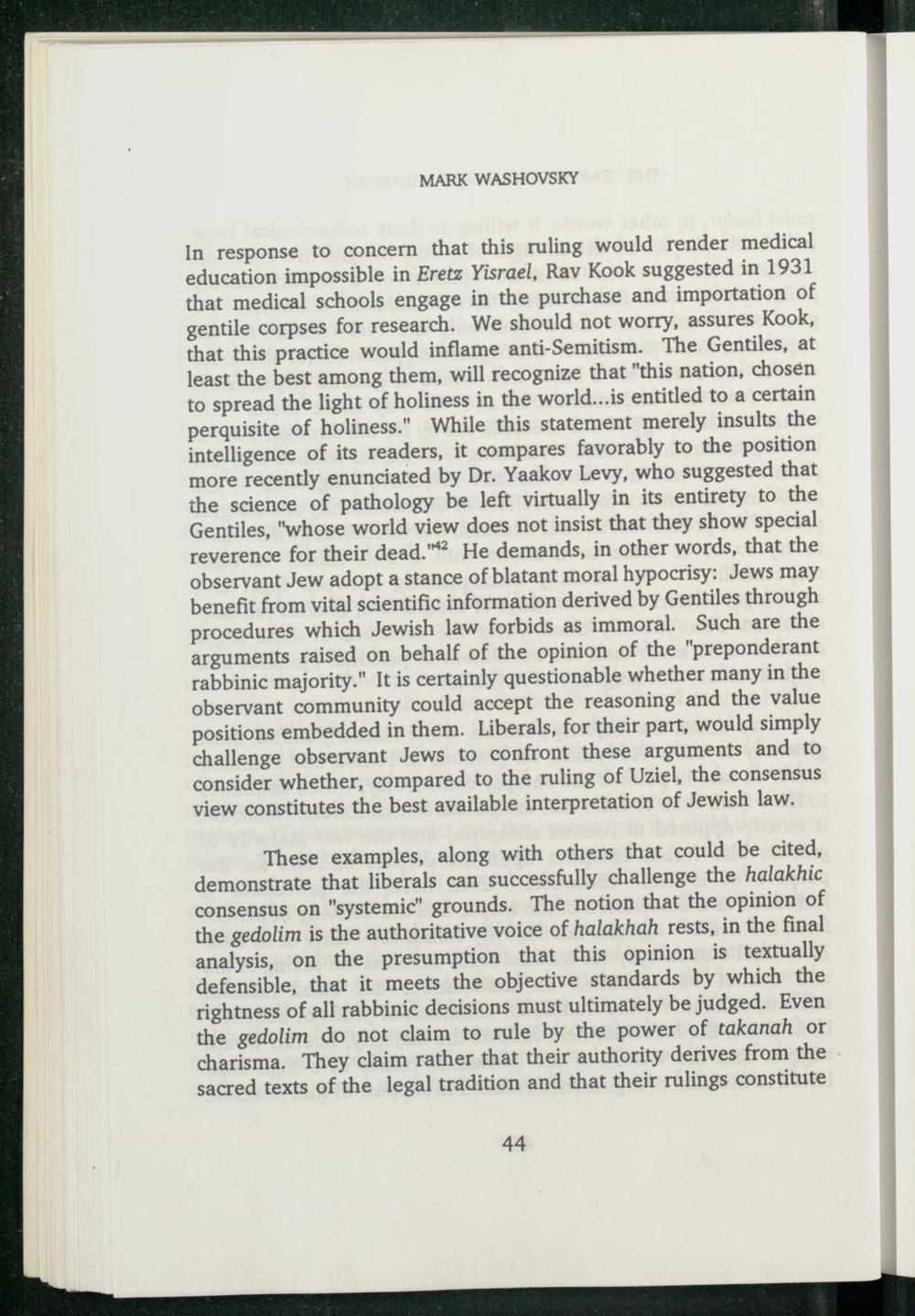 In response to concern that this ruling would render medical education impossible in Eretz Yisrael, Rav Kook suggested in 1931 that medical schools engage in the purchase and importation of gentile corpses for research. We should not worry, assures Kook, that this practice would inflame anti-Semitism. The Gentiles, at least the best among them, will recognize that"this nation, chosen to spread the light of holiness in the world...is entitled to a certain perquisite of holiness." While this statement merely insults the intelligence of its readers, it compares favorably to the position more recently enunciated by Dr. Yaakov Levy, who suggested that the science of pathology be left virtually in its entirety to the Gentiles,"whose world view does not insist that they show special reverence for their dead.” He demands, in other words, that the observant Jew adopt a stance of blatant moral hypocrisy: Jews may benefit from vital scientific information derived by Gentiles through procedures which Jewish law forbids as immoral. Such are the arguments raised on behalf of the opinion of the"preponderant rabbinic majority." It is certainly questionable whether many in the observant community could accept the reasoning and the value positions embedded in them. Liberals, for their part, would simply challenge observant Jews to confront these arguments and to consider whether, compared to the ruling of Uziel, the consensus view constitutes the best available interpretation of Jewish law.