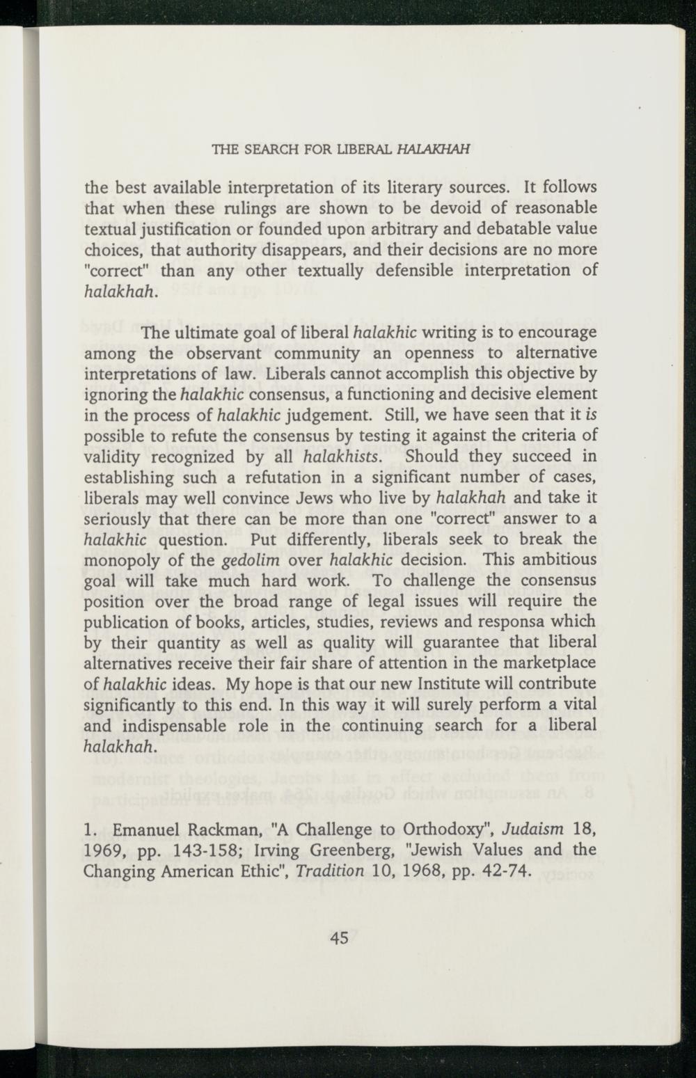 The ultimate goal of liberal halakhic writing is to encourage among the observant community an openness to alternative interpretations of law. Liberals cannot accomplish this objective by ignoring the halakhic consensus, a functioning and decisive element in the process of halakhic judgement. Still, we have seen that it is possible to refute the consensus by testing it against the criteria of validity recognized by all halakhists. Should they succeed in establishing such a refutation in a significant number of cases, liberals may well convince Jews who live by halakhah and take it seriously that there can be more than one"correct" answer to a halakhic question. Put differently, liberals seek to break the monopoly of the gedolim over halakhic decision. This ambitious goal will take much hard work. To challenge the consensus position over the broad range of legal issues will require the publication of books, articles, studies, reviews and responsa which by their quantity as well as quality will guarantee that liberal alternatives receive their fair share of attention in the marketplace of halakhic ideas. My hope is that our new Institute will contribute significantly to this end. In this way it will surely perform a vital and indispensable role in the continuing search for a liberal halakhah.
