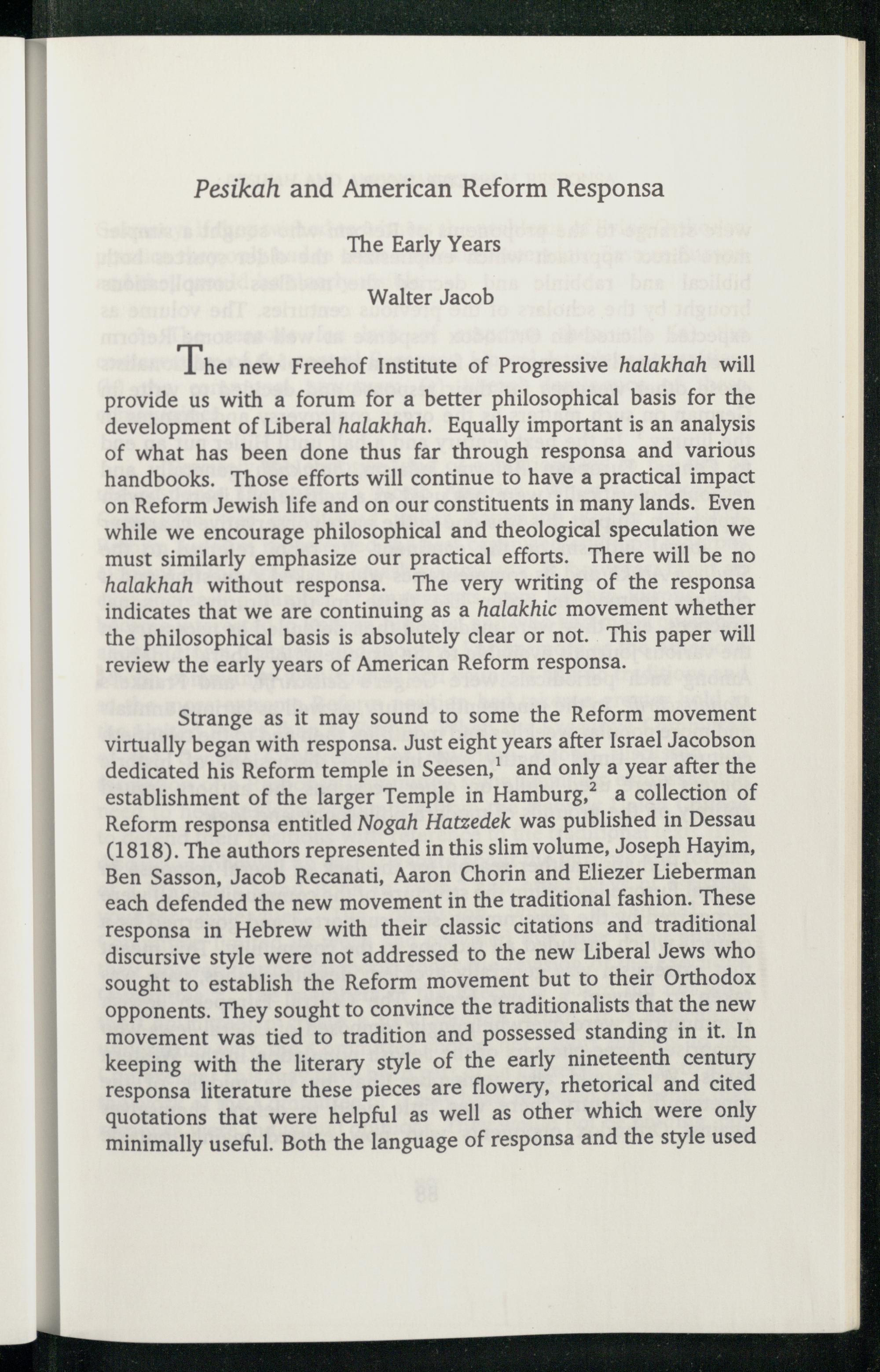 Strange as it may sound to some the Reform movement virtually began with responsa. Just eight years after Israel Jacobson dedicated his Reform temple in Seesen, ' and only a year after the establishment of the larger Temple in Hamburg,? a collection of Reform responsa entitled Nogah Hatzedek was published in Dessau (1818). The authors represented in this slim volume, Joseph Hayim, Ben Sasson , Jacob Recanati, Aaron Chorin and Eliezer Lieberman each defended the new movement in the traditional fashion. These responsa in Hebrew with their classic citations and traditional discursive style were not addressed to the new Liberal Jews who sought to establish the Reform movement but to their Orthodox opponents. They sought to convince the traditionalists that the new movement was tied to tradition and possessed standing in it. In keeping with the literary style of the early nineteenth century responsa literature these pieces are flowery, rhetorical and cited quotations that were helpful as well as other which were only minimally useful. Both the language of responsa and the style used