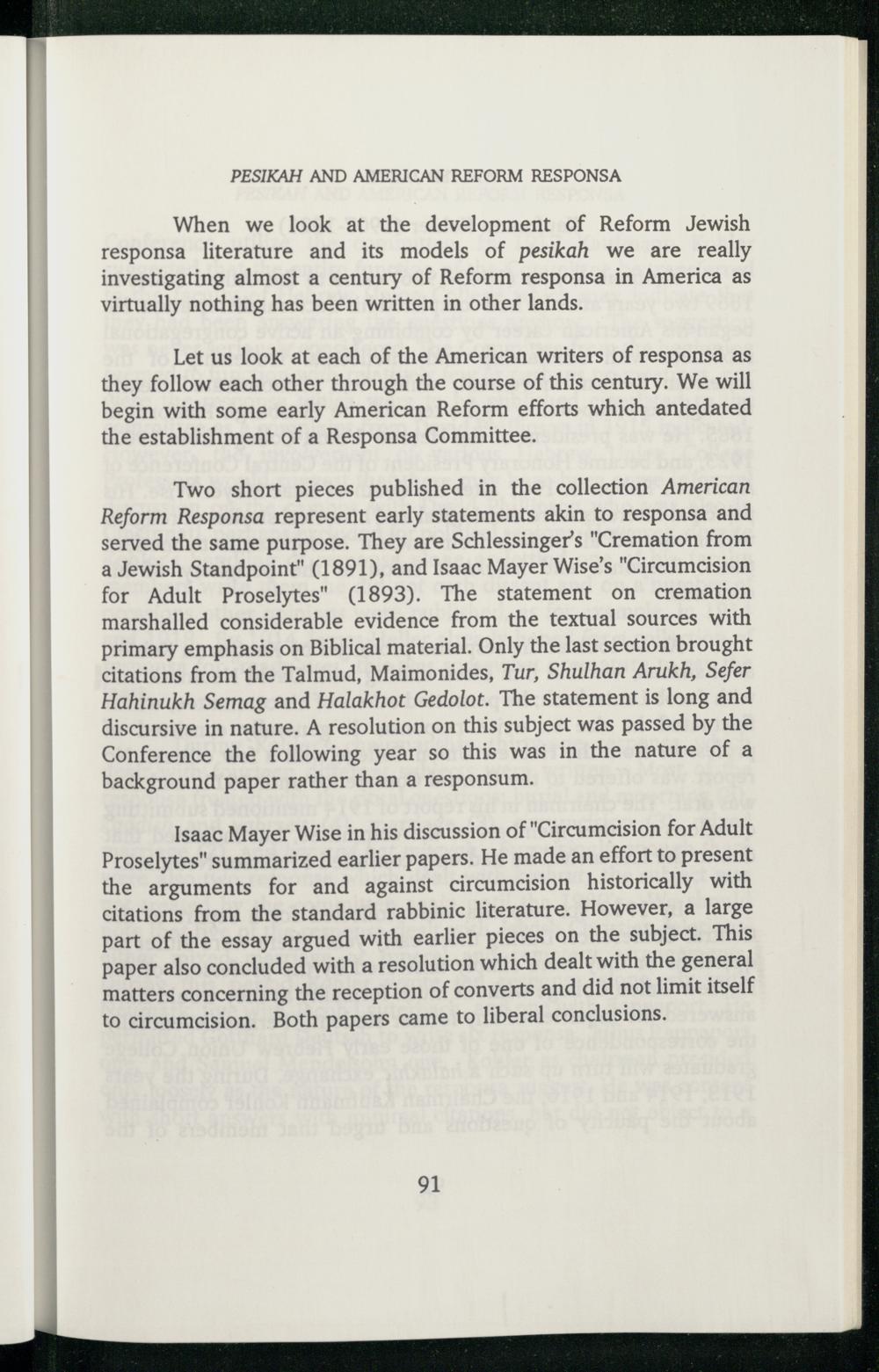 Reform Responsa represent early statements akin to responsa and served the same purpose. They are Schlessinger’s"Cremation from a Jewish Standpoint"(1891), and Isaac Mayer Wise ’s"Circumcision for Adult Proselytes"(1893). The statement on cremation marshalled considerable evidence from the textual sources with primary emphasis on Biblical material. Only the last section brought citations from the Talmud , Maimonides , Tur, Shulhan Arukh, Sefer Hahinukh Semag and Halakhot Gedolot. The statement is long and discursive in nature. A resolution on this subject was passed by the Conference the following year so this was in the nature of a background paper rather than a responsum.