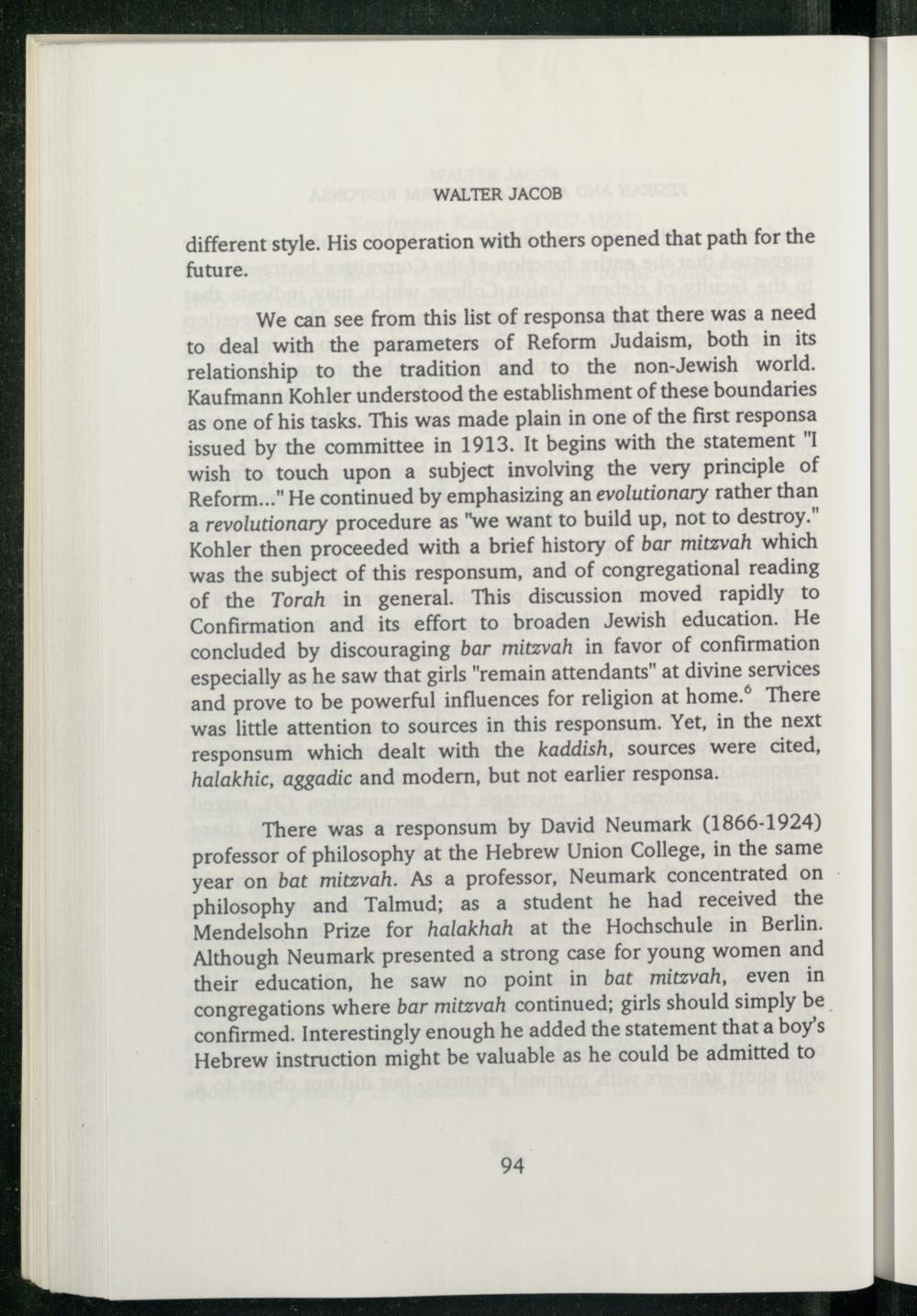 We can see from this list of responsa that there was a need to deal with the parameters of Reform Judaism, both in its relationship to the tradition and to the non-Jewish world. Kaufmann Kohler understood the establishment of these boundaries as one of his tasks. This was made plain in one of the first responsa issued by the committee in 1913. It begins with the statement"I wish to touch upon a subject involving the very principle of Reform..." He continued by emphasizing an evolutionary rather than a revolutionary procedure as"we want to build up, not to destroy." Kohler then proceeded with a brief history of bar mitzvah which was the subject of this responsum, and of congregational reading of the Torah in general. This discussion moved rapidly to Confirmation and its effort to broaden Jewish education. He concluded by discouraging bar mitzvah in favor of confirmation especially as he saw that girls"remain attendants” at divine services and prove to be powerful influences for religion at home.’ There was little attention to sources in this responsum. Yet, in the next responsum which dealt with the kaddish, sources were cited, halakhic, aggadic and modern, but not earlier responsa.
