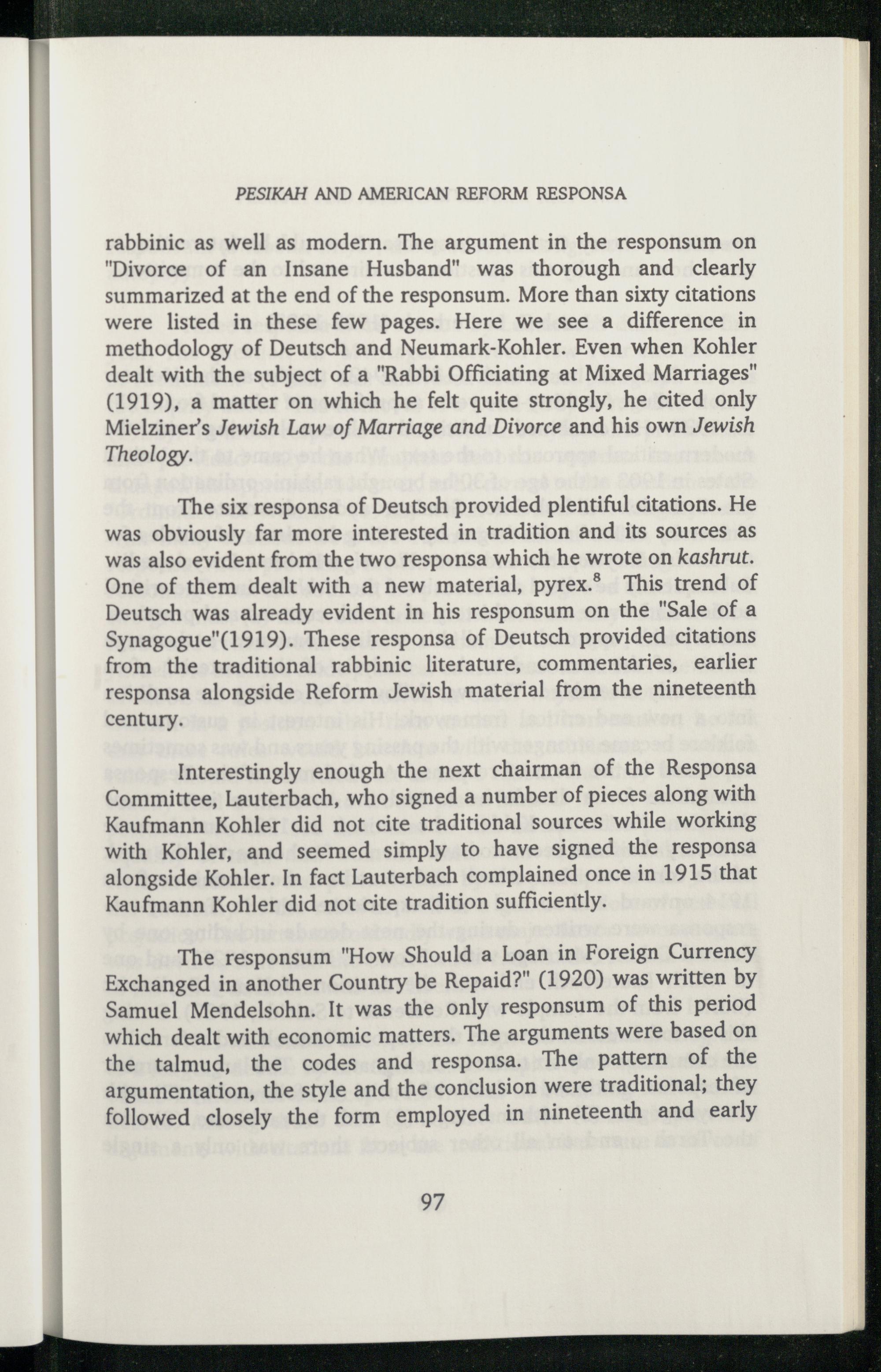rabbinic as well as modern. The argument in the responsum on "Divorce of an Insane Husband" was thorough and clearly summarized at the end of the responsum. More than sixty citations were listed in these few pages. Here we see a difference in methodology of Deutsch and Neumark-Kohler. Even when Kohler dealt with the subject of a"Rabbi Officiating at Mixed Marriages" (1919), a matter on which he felt quite strongly, he cited only Mielziner ’s Jewish Law of Marriage and Divorce and his own Jewish Theology.