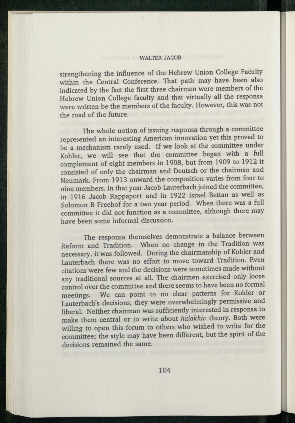 The responsa themselves demonstrate a balance between Reform and Tradition. When no change in the Tradition was necessary, it was followed. During the chairmanship of Kohler and Lauterbach there was no effort to move toward Tradition. Even citations were few and the decisions were sometimes made without any traditional sources at all. The chairmen exercised only loose control over the committee and there seems to have been no formal meetings. We can point to no clear patterns for Kohler or Lauterbach ’s decisions; they were overwhelmingly permissive and liberal. Neither chairman was sufficiently interested in responsa to make them central or to write about halakhic theory. Both were willing to open this forum to others who wished to write for the committee; the style may have been different, but the spirit of the decisions remained the same.