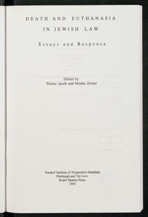 DEATH AND EUTHANASIA IN JEWISH LAW Essays and Responsa Edited by Walter Jacob and Moshe Zemer Freehof Institute of Progressive Halakhah Pittsburgh and Tel Aviv Rodef Shalom Press 1995