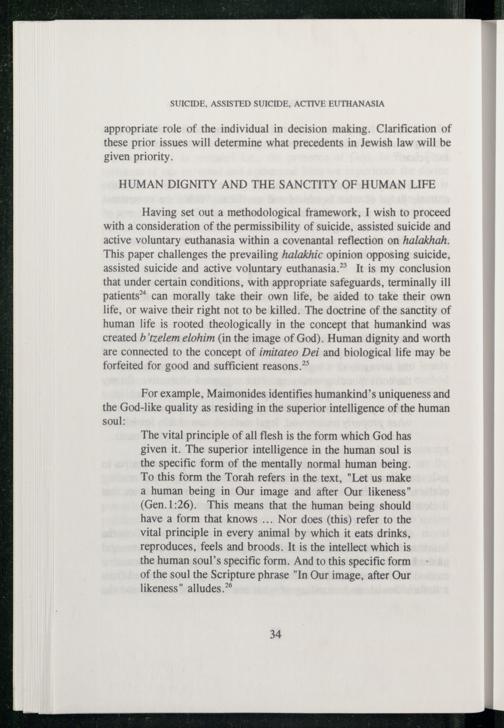 Having set out a methodological framework, I wish to proceed with a consideration of the permissibility of suicide, assisted suicide and active voluntary euthanasia within a covenantal reflection on halakhah. This paper challenges the prevailing halakhic opinion opposing suicide, assisted suicide and active voluntary euthanasia.” It is my conclusion that under certain conditions, with appropriate safeguards, terminally ill patients can morally take their own life, be aided to take their own life, or waive their right not to be killed. The doctrine of the sanctity of human life is rooted theologically in the concept that humankind was created b’tzelem elohim(in the image of God ). Human dignity and worth are connected to the concept of imitateo Dei and biological life may be forfeited for good and sufficient reasons.”