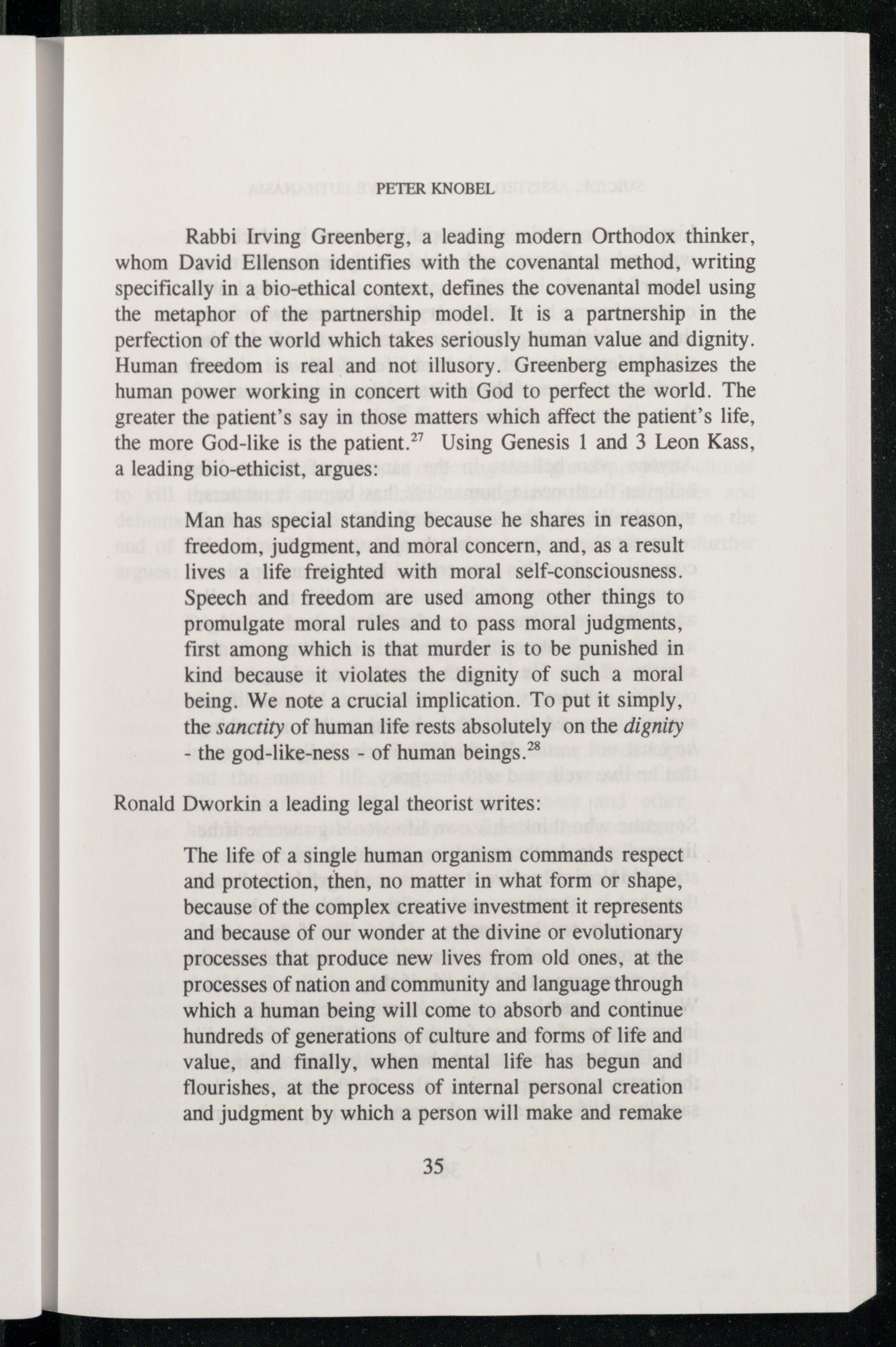 Rabbi Irving Greenberg , a leading modern Orthodox thinker , whom David Ellenson identifies with the covenantal method, writing specifically in a bio-ethical context, defines the covenantal model using the metaphor of the partnership model. It is a partnership in the perfection of the world which takes seriously human value and dignity. Human freedom is real and not illusory. Greenberg emphasizes the human power working in concert with God to perfect the world. The greater the patient’s say in those matters which affect the patient’s life, the more God -like is the patient.”’ Using Genesis 1 and 3 Leon Kass , a leading bio-ethicist , argues: