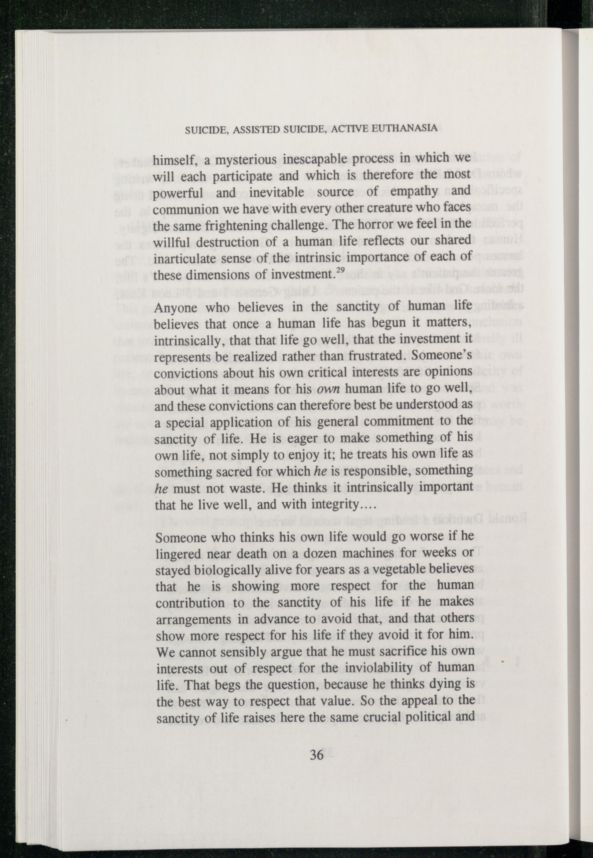 Someone who thinks his own life would go worse if he lingered near death on a dozen machines for weeks or stayed biologically alive for years as a vegetable believes that he is showing more respect for the human contribution to the sanctity of his life if he makes arrangements in advance to avoid that, and that others show more respect for his life if they avoid it for him. We cannot sensibly argue that he must sacrifice his own interests out of respect for the inviolability of human life. That begs the question, because he thinks dying is the best way to respect that value. So the appeal to the sanctity of life raises here the same crucial political and