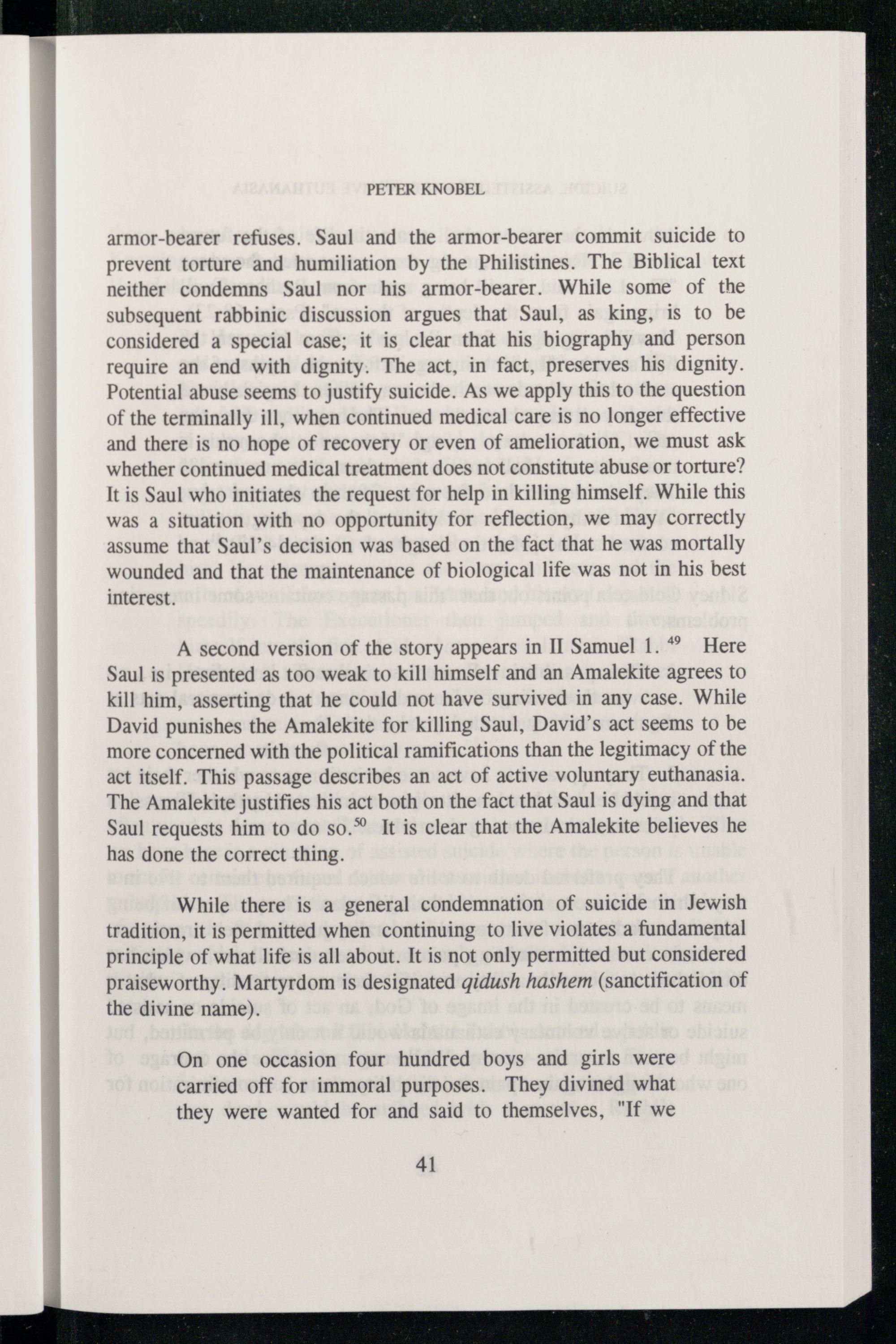 armor-bearer refuses. Saul and the armor-bearer commit suicide to prevent torture and humiliation by the Philistines . The Biblical text neither condemns Saul nor his armor-bearer. While some of the subsequent rabbinic discussion argues that Saul , as king, is to be considered a special case; it is clear that his biography and person require an end with dignity. The act, in fact, preserves his dignity. Potential abuse seems to justify suicide. As we apply this to the question of the terminally ill, when continued medical care is no longer effective and there is no hope of recovery or even of amelioration, we must ask whether continued medical treatment does not constitute abuse or torture? It is Saul who initiates the request for help in killing himself. While this was a situation with no opportunity for reflection, we may correctly assume that Saul ’s decision was based on the fact that he was mortally wounded and that the maintenance of biological life was not in his best interest.