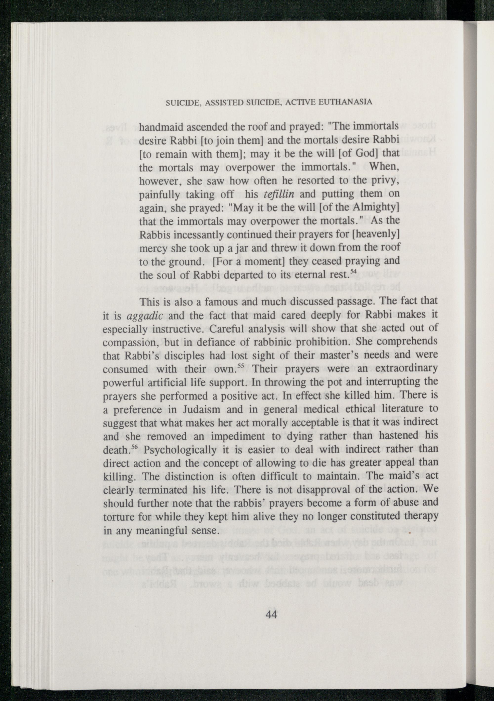 This is also a famous and much discussed passage. The fact that it is aggadic and the fact that maid cared deeply for Rabbi makes it especially instructive. Careful analysis will show that she acted out of compassion, but in defiance of rabbinic prohibition. She comprehends that Rabbi ’s disciples had lost sight of their master’s needs and were consumed with their own.” Their prayers were an extraordinary powerful artificial life support. In throwing the pot and interrupting the prayers she performed a positive act. In effect she killed him. There is a preference in Judaism and in general medical ethical literature to suggest that what makes her act morally acceptable is that it was indirect and she removed an impediment to dying rather than hastened his death.* Psychologically it is easier to deal with indirect rather than direct action and the concept of allowing to die has greater appeal than killing. The distinction is often difficult to maintain. The maid’s act clearly terminated his life. There is not disapproval of the action. We should further note that the rabbis’ prayers become a form of abuse and torture for while they kept him alive they no longer constituted therapy in any meaningful sense.