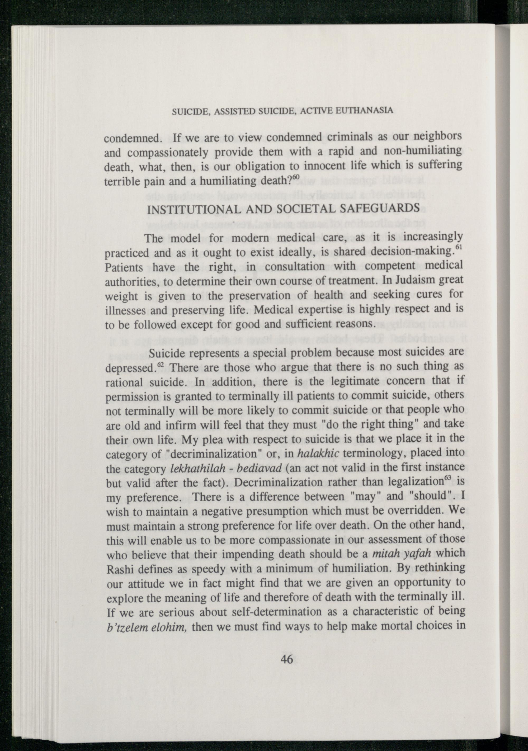 Suicide represents a special problem because most suicides are depressed.” There are those who argue that there is no such thing as rational suicide. In addition, there is the legitimate concern that if permission is granted to terminally ill patients to commit suicide, others not terminally will be more likely to commit suicide or that people who are old and infirm will feel that they must"do the right thing" and take their own life. My plea with respect to suicide is that we place it in the category of"decriminalization" or, in halakhic terminology, placed into the category lekhathilah- bediavad(an act not valid in the first instance but valid after the fact). Decriminalization rather than legalization® is my preference. There is a difference between"may" and"should". I wish to maintain a negative presumption which must be overridden. We must maintain a strong preference for life over death. On the other hand, this will enable us to be more compassionate in our assessment of those who believe that their impending death should be a mitah yafah which Rashi defines as speedy with a minimum of humiliation. By rethinking our attitude we in fact might find that we are given an opportunity to explore the meaning of life and therefore of death with the terminally ill. If we are serious about self-determination as a characteristic of being b’tzelem elohim, then we must find ways to help make mortal choices in