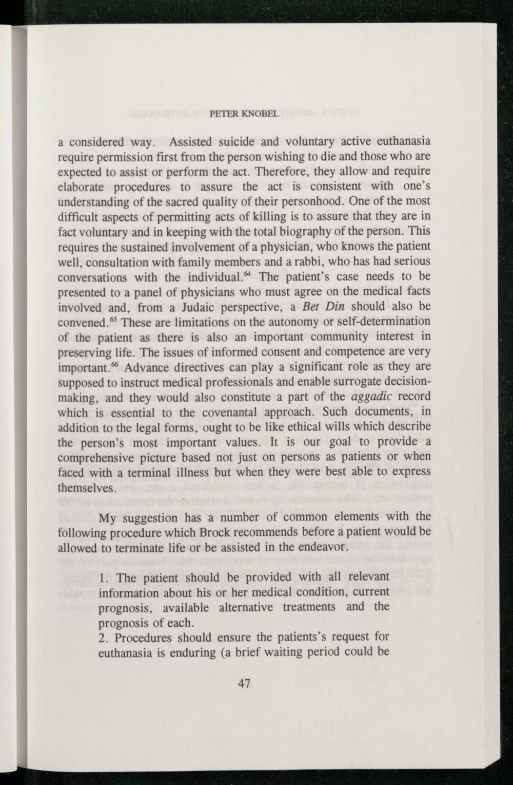 a considered way. Assisted suicide and voluntary active euthanasia require permission first from the person wishing to die and those who are expected to assist or perform the act. Therefore, they allow and require elaborate procedures to assure the act is consistent with one’s understanding of the sacred quality of their personhood. One of the most difficult aspects of permitting acts of killing is to assure that they are in fact voluntary and in keeping with the total biography of the person. This requires the sustained involvement of a physician, who knows the patient well, consultation with family members and a rabbi, who has had serious conversations with the individual.* The patient’s case needs to be presented to a panel of physicians who must agree on the medical facts involved and, from a Judaic perspective, a Bet Din should also be convened.” These are limitations on the autonomy or self-determination of the patient as there is also an important community interest in preserving life. The issues of informed consent and competence are very important. Advance directives can play a significant role as they are supposed to instruct medical professionals and enable surrogate decisionmaking, and they would also constitute a part of the aggadic record which is essential to the covenantal approach. Such documents, in addition to the legal forms, ought to be like ethical wills which describe the person’s most important values. It is our goal to provide a comprehensive picture based not just on persons as patients or when faced with a terminal illness but when they were best able to express themselves.
