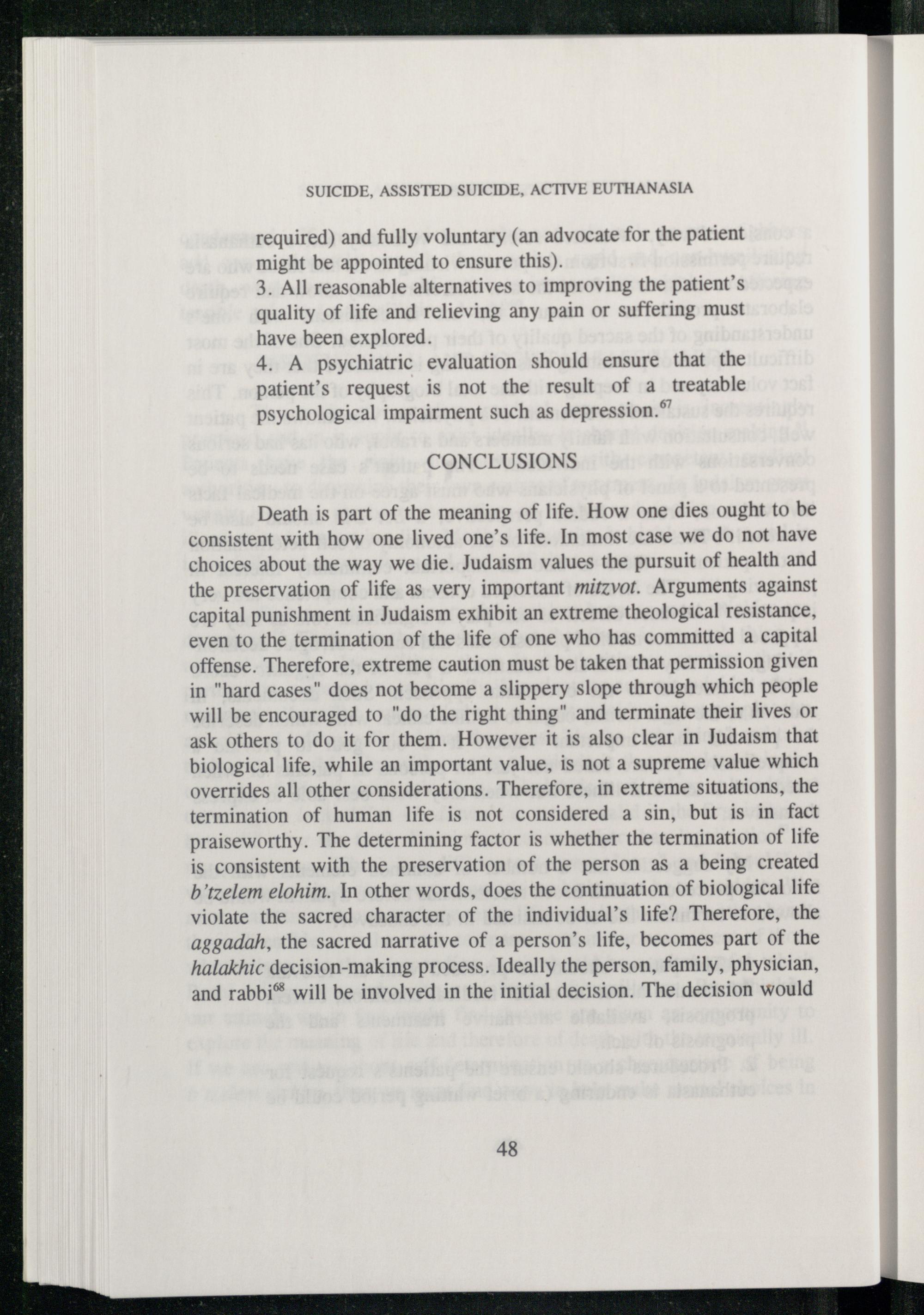Death is part of the meaning of life. How one dies ought to be consistent with how one lived one’s life. In most case we do not have choices about the way we die. Judaism values the pursuit of health and the preservation of life as very important mitzvor. Arguments against capital punishment in Judaism exhibit an extreme theological resistance, even to the termination of the life of one who has committed a capital offense. Therefore, extreme caution must be taken that permission given in"hard cases" does not become a slippery slope through which people will be encouraged to"do the right thing" and terminate their lives or ask others to do it for them. However it is also clear in Judaism that biological life, while an important value, is not a supreme value which overrides all other considerations. Therefore, in extreme situations, the termination of human life is not considered a sin, but is in fact praiseworthy. The determining factor is whether the termination of life is consistent with the preservation of the person as a being created b’tzelem elohim. In other words, does the continuation of biological life violate the sacred character of the individual's life? Therefore, the aggadah, the sacred narrative of a person’s life, becomes part of the halakhic decision-making process. Ideally the person, family, physician, and rabbi® will be involved in the initial decision. The decision would