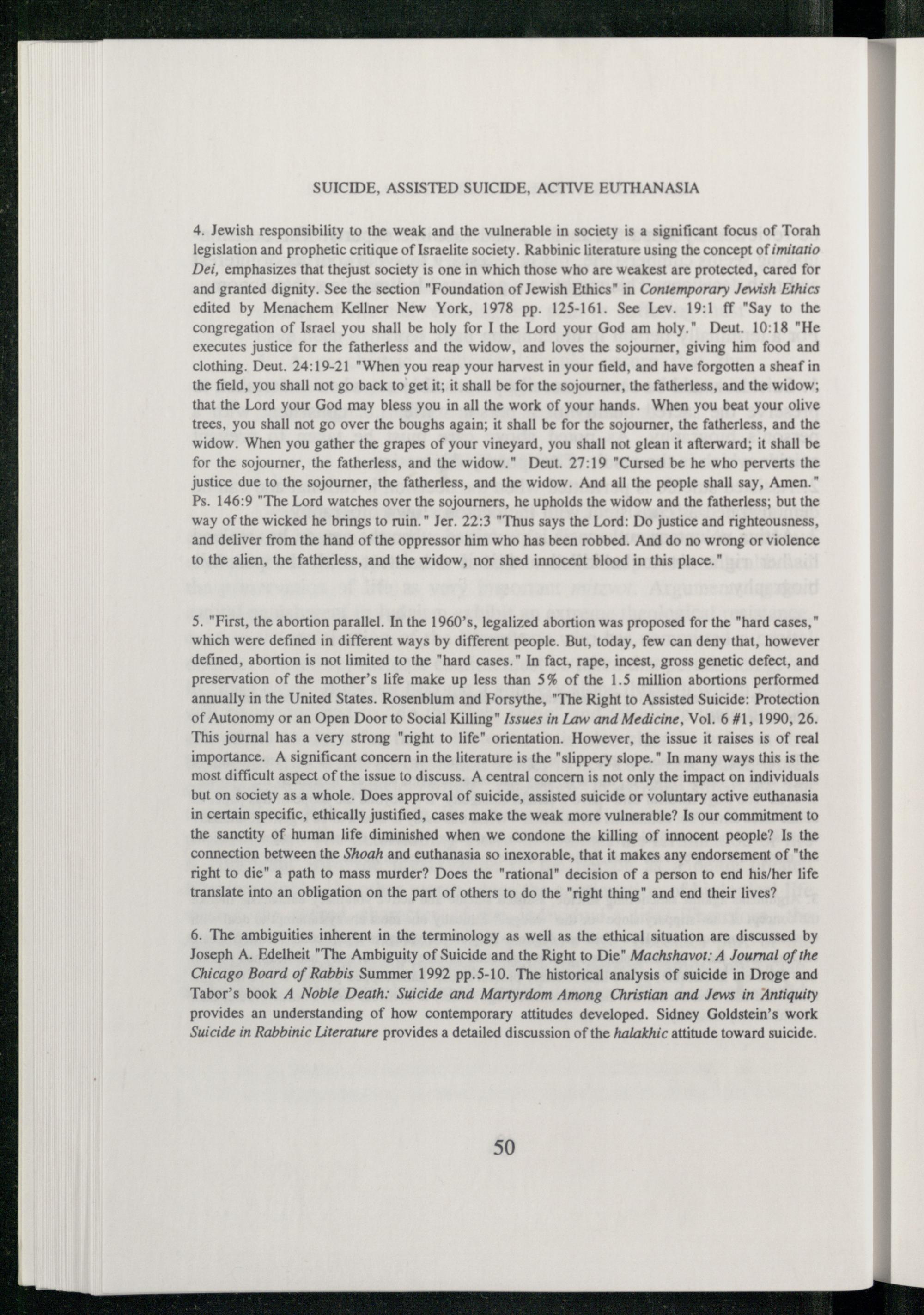 6. The ambiguities inherent in the terminology as well as the ethical situation are discussed by Joseph A. Edelheit"The Ambiguity of Suicide and the Right to Die" Machshavot: A Journal of the Chicago Board of Rabbis Summer 1992 pp.5-10. The historical analysis of suicide in Droge and Tabor’s book A Noble Death: Suicide and Martyrdom Among Christian and Jews in Antiquity provides an understanding of how contemporary attitudes developed. Sidney Goldstein’s work Suicide in Rabbinic Literature provides a detailed discussion of the halakhic attitude toward suicide.