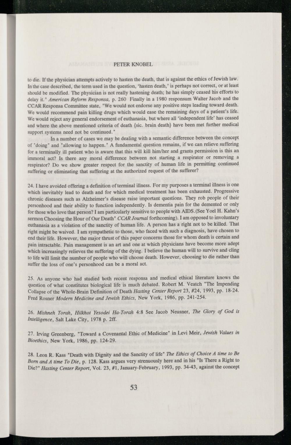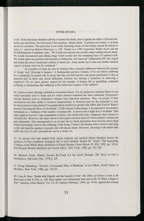 24. 1 have avoided offering a definition of terminal illness. For my purposes a terminal illness is one which inevitably lead to death and for which medical treatment has been exhausted. Progressive chronic diseases such as Alzheimer’s disease raise important questions. They rob people of their personhood and their ability to function independently. Is dementia pain for the demented or only for those who love that person? I am particularly sensitive to people with AIDS. (See Yoel H. Kahn’s sermon Choosing the Hour of Our Death" CCAR Journal forthcoming). I am opposed to involuntary euthanasia as a violation of the sanctity of human life. A person has a right not to be killed. That right might be waived. I am sympathetic to those, who faced with such a diagnosis, have chosen to end their life. However, the major thrust of this paper concerns those for whom death is certain and pain intractable. Pain management is an art and one at which physicians have become more adept which increasingly relieves the suffering of the dying. I believe the human will to survive and cling to life will limit the number of people who will choose death. However, choosing to die rather than suffer the loss of one’s personhood can be a moral act.