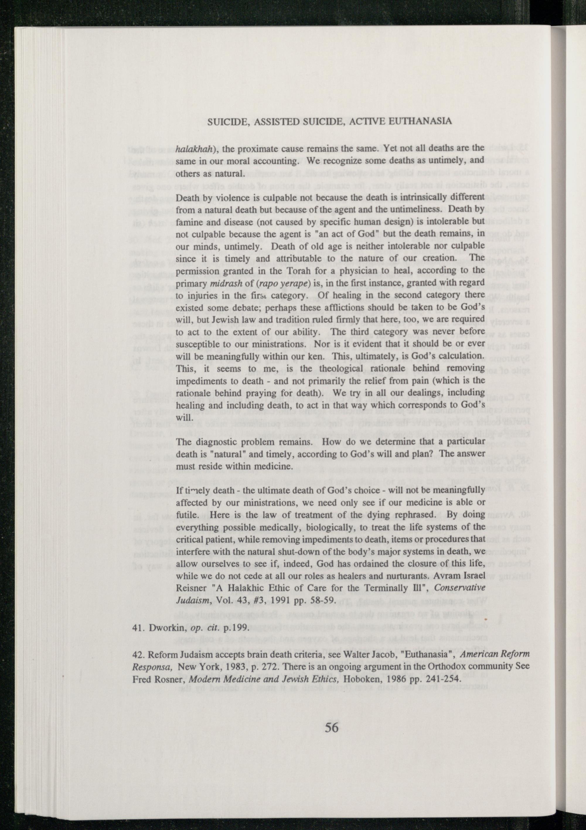 42. Reform Judaism accepts brain death criteria, see Walter Jacob ,"Euthanasia ", American Reform Responsa, New York , 1983, p. 272. There is an ongoing argument in the Orthodox community See Fred Rosner , Modern Medicine and Jewish Ethics, Hoboken , 1986 pp. 241-254.