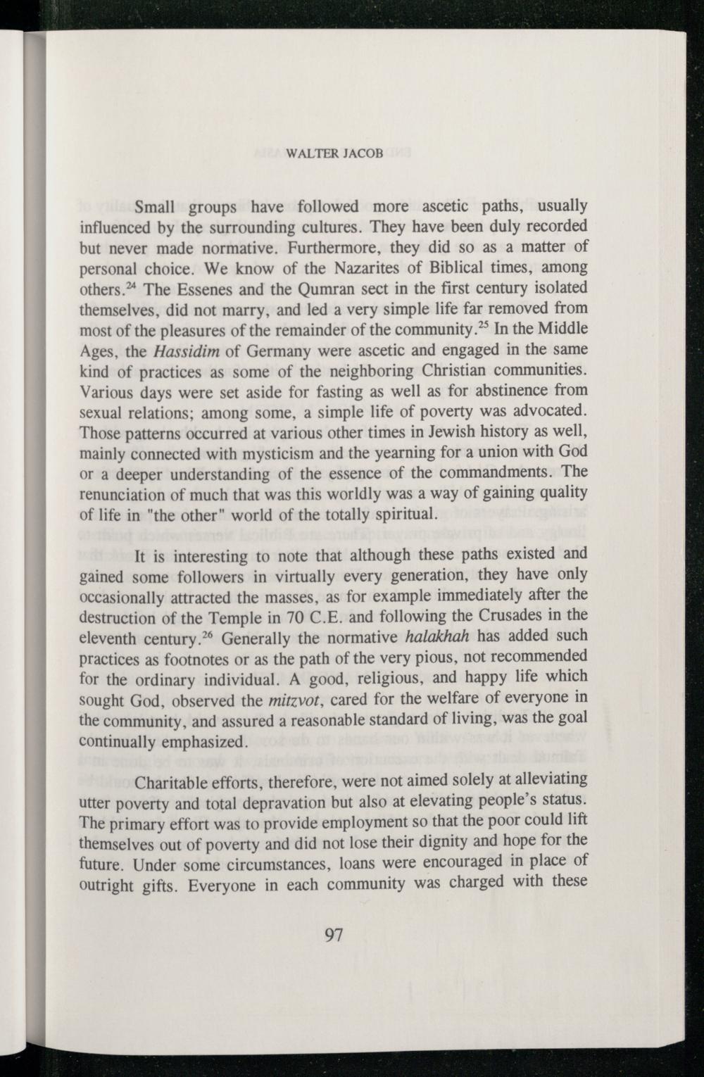 Small groups have followed more ascetic paths, usually influenced by the surrounding cultures. They have been duly recorded but never made normative. Furthermore, they did so as a matter of personal choice. We know of the Nazarites of Biblical times, among others.” The Essenes and the Qumran sect in the first century isolated themselves, did not marry, and led a very simple life far removed from most of the pleasures of the remainder of the community.* In the Middle Ages, the Hassidim of Germany were ascetic and engaged in the same kind of practices as some of the neighboring Christian communities. Various days were set aside for fasting as well as for abstinence from sexual relations; among some, a simple life of poverty was advocated. Those patterns occurred at various other times in Jewish history as well, mainly connected with mysticism and the yearning for a union with God or a deeper understanding of the essence of the commandments. The renunciation of much that was this worldly was a way of gaining quality of life in"the other" world of the totally spiritual.