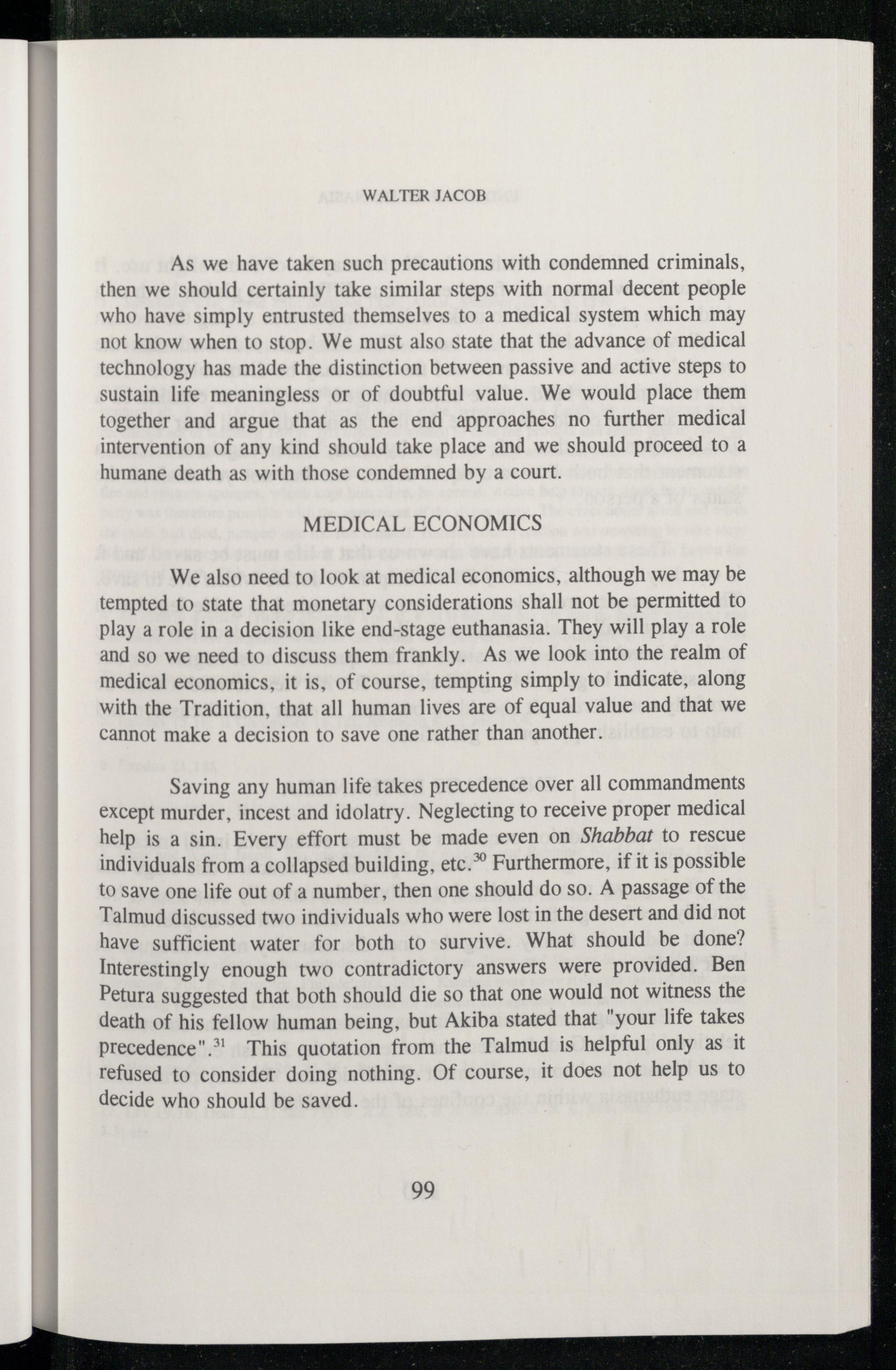 We also need to look at medical economics, although we may be tempted to state that monetary considerations shall not be permitted to play a role in a decision like end-stage euthanasia. They will play a role and so we need to discuss them frankly. As we look into the realm of medical economics, it is, of course, tempting simply to indicate, along with the Tradition, that all human lives are of equal value and that we cannot make a decision to save one rather than another.