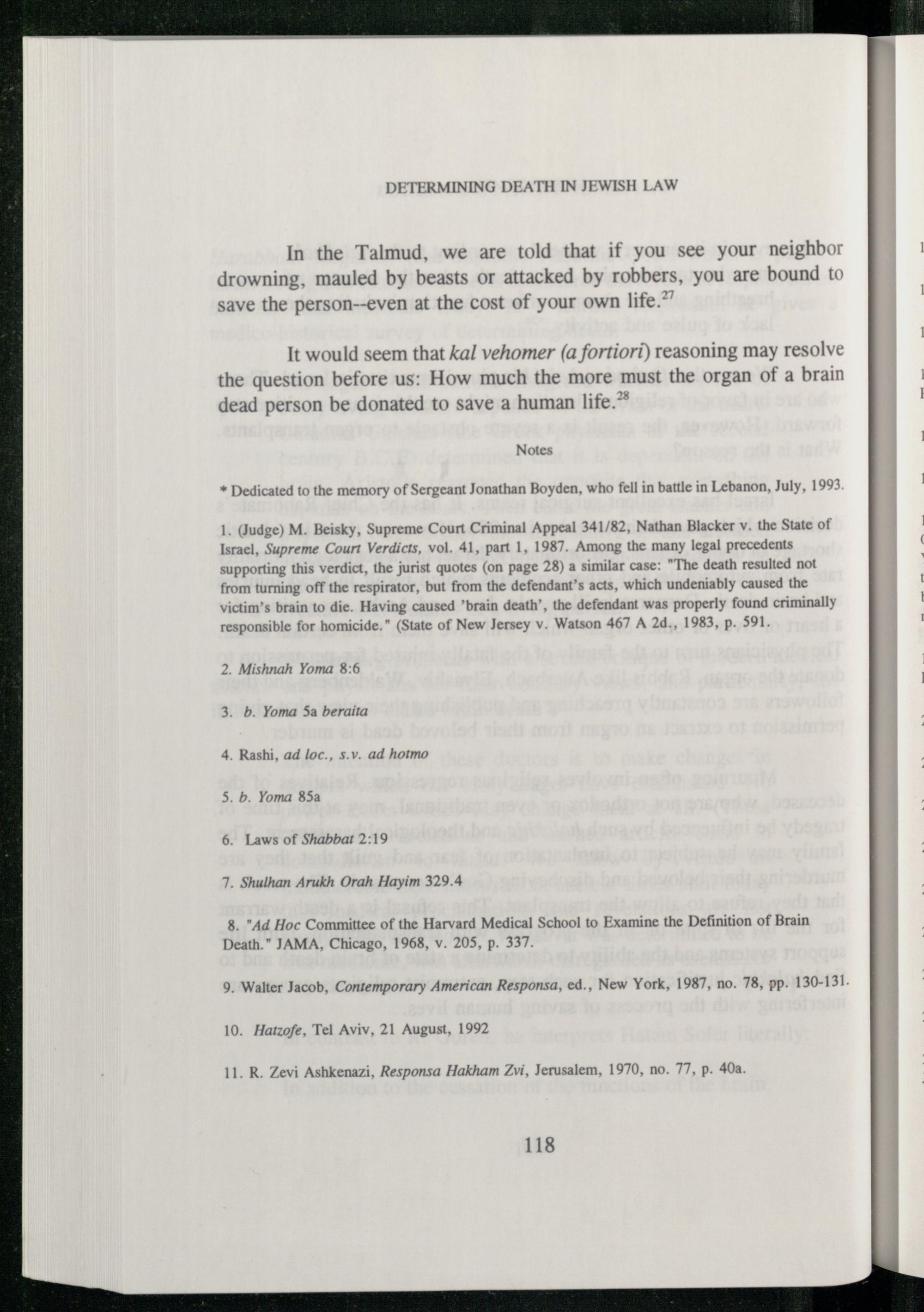 * Dedicated to the memory of Sergeant Jonathan Boyden, who fell in battle in Lebanon, July, 1993 1.(Judge) M. Beisky, Supreme Court Criminal Appeal 341/82, Nathan Blacker v. the State of Israel, Supreme Court Verdicts, vol. 41, part 1, 1987. Among the many legal precedents supporting this verdict, the jurist quotes(on page 28) a similar case:"The death resulted not from turning off the respirator, but from the defendant’s acts, which undeniably caused the victim’s brain to die. Having caused’brain death’, the defendant was properly found criminally responsible for homicide."(State of New Jersey v. Watson 467 A 2d., 1983, p. 591. 2. Mishnah Yoma 8:6