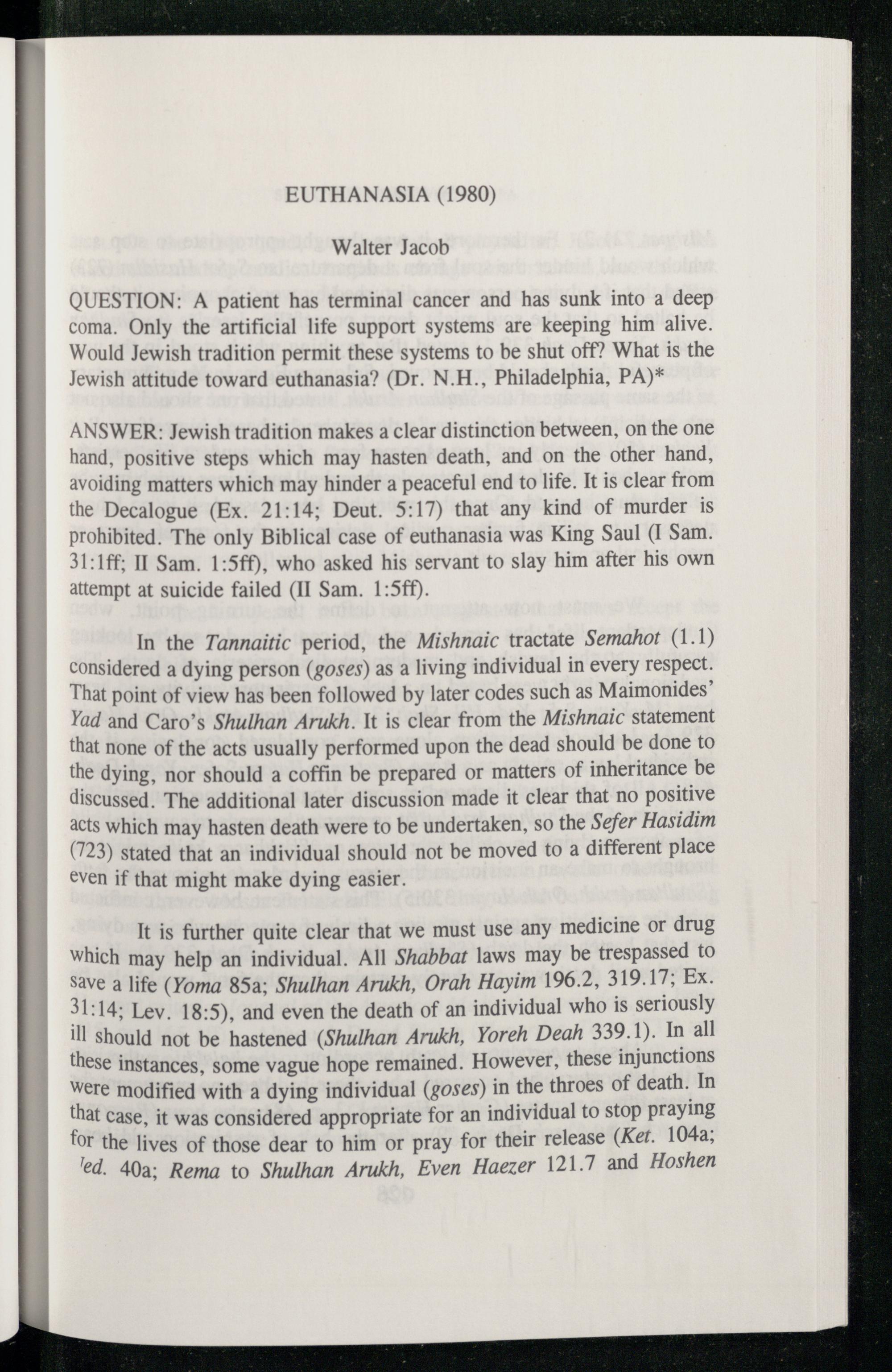 ANSWER: Jewish tradition makes a clear distinction between, on the one hand, positive steps which may hasten death, and on the other hand, avoiding matters which may hinder a peaceful end to life. It is clear from the Decalogue(Ex. 21:14; Deut. 5:17) that any kind of murder is prohibited. The only Biblical case of euthanasia was King Saul(I Sam. 31:1ff: II Sam. 1:5ff), who asked his servant to slay him after his own attempt at suicide failed(II Sam. 1:5ff).