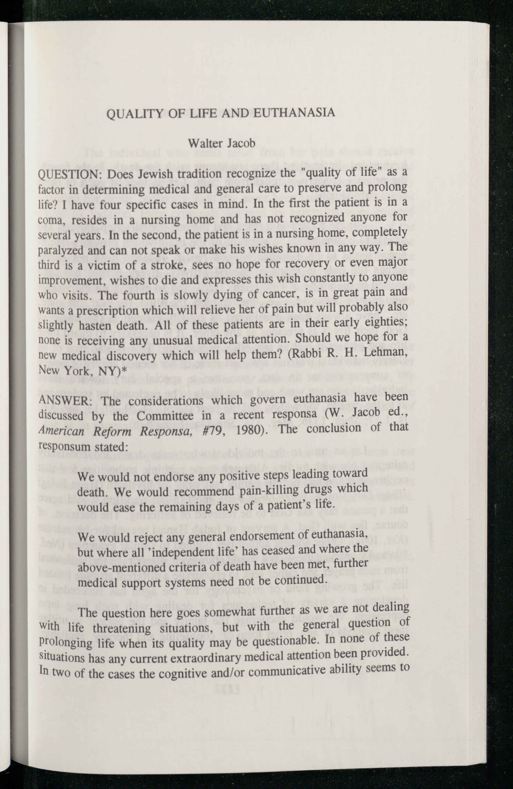 QUALITY OF LIFE AND EUTHANASIA Walter Jacob
