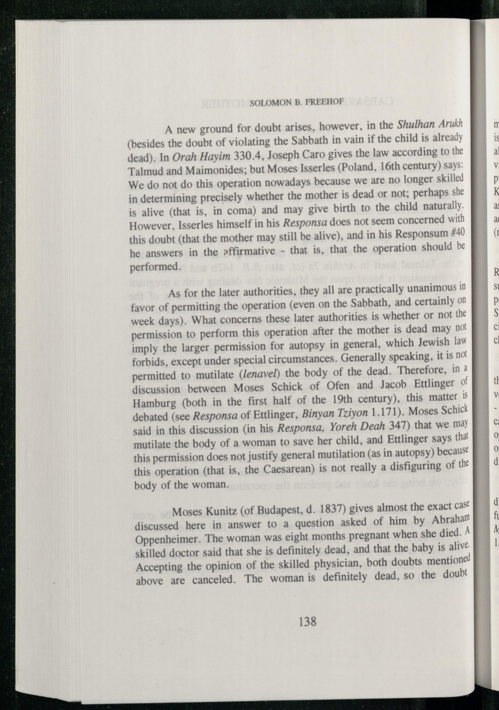 forbids, except under special circumstances. Generally speaking, it is nol permitted to mutilate(lenavel) the body of the dead. Therefore, in discussion between Moses Schick of Ofen and Jacob Ettlinger of Hamburg(both in the first half of the 19th century), this matter is debated(see Responsa of Ettlinger, Binyan Tziyon 1.171). Moses Schick said in this discussion(in his Responsa, Yoreh Deah 347) that we ma) mutilate the body of a woman to save her child, and Ettlinger says tha this permission does not justify general mutilation(as in autopsy) becaus¢ this operation(that is, the Caesarean ) is not really a disfiguring of the body of the woman.