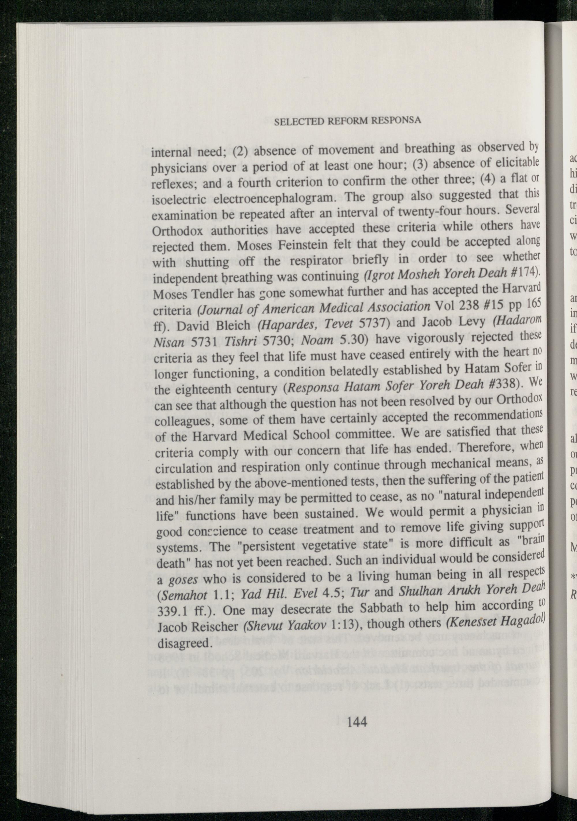 internal need;( 2) absence of movement and breathing as observed by physicians over a period of at least one hour;( 3) absence of elicitable reflexes; and a fourth criterion to confirm the other three;( 4) a flat or isoelectric electroencephalogram. The group also suggested that this examination be repeated after an interval of twenty- four hours. Several Orthodox authorities have accepted these criteria while others have rejected them. Moses Feinstein felt that they could be accepted along with shutting off the respirator briefly in order to see whether independent breathing was continuing( Igrot Mosheh Yoreh Deah# 174). Moses Tendler has gone somewhat further and has accepted the Harvard criteria( Journal of American Medical Association Vol 238# 15 pp 165 ff). David Bleich ( Hapardes, Tevet 5737) and Jacob Levy( Hadarom Nisan 5731 Tishri 5730; Noam 5.30) have vigorously rejected these criteria as they feel that life must have ceased entirely with the heart no longer functioning, a condition belatedly established by Hatam Sofer in the eighteenth century( Responsa Hatam Sofer Yoreh Deah# 338). We can see that although the question has not been resolved by our Orthodox colleagues, some of them have certainly accepted the recommendations of the Harvard Medical School committee. We are satisfied that these criteria comply with our concern that life has ended. Therefore, when circulation and respiration only continue through mechanical means, as established by the above- mentioned tests, then the suffering of the patient and his/ her family may be permitted to cease, as no" natural independent life" functions have been sustained. We would permit a physician in good conscience to cease treatment and to remove life giving support systems. The" persistent vegetative state" is more difficult as" brain death" has not yet been reached. Such an individual would be considered a goses who is considered to be a living human being in all respects ( Semahot 1.1; Yad Hil. Evel 4.5; Tur and Shulhan Arukh Yoreh Deah 339.1 ff.). One may desecrate the Sabbath to help him according to Jacob Reischer ( Shevut Yaakov 1:13), though others( Kenesset Hagadol) disagreed.