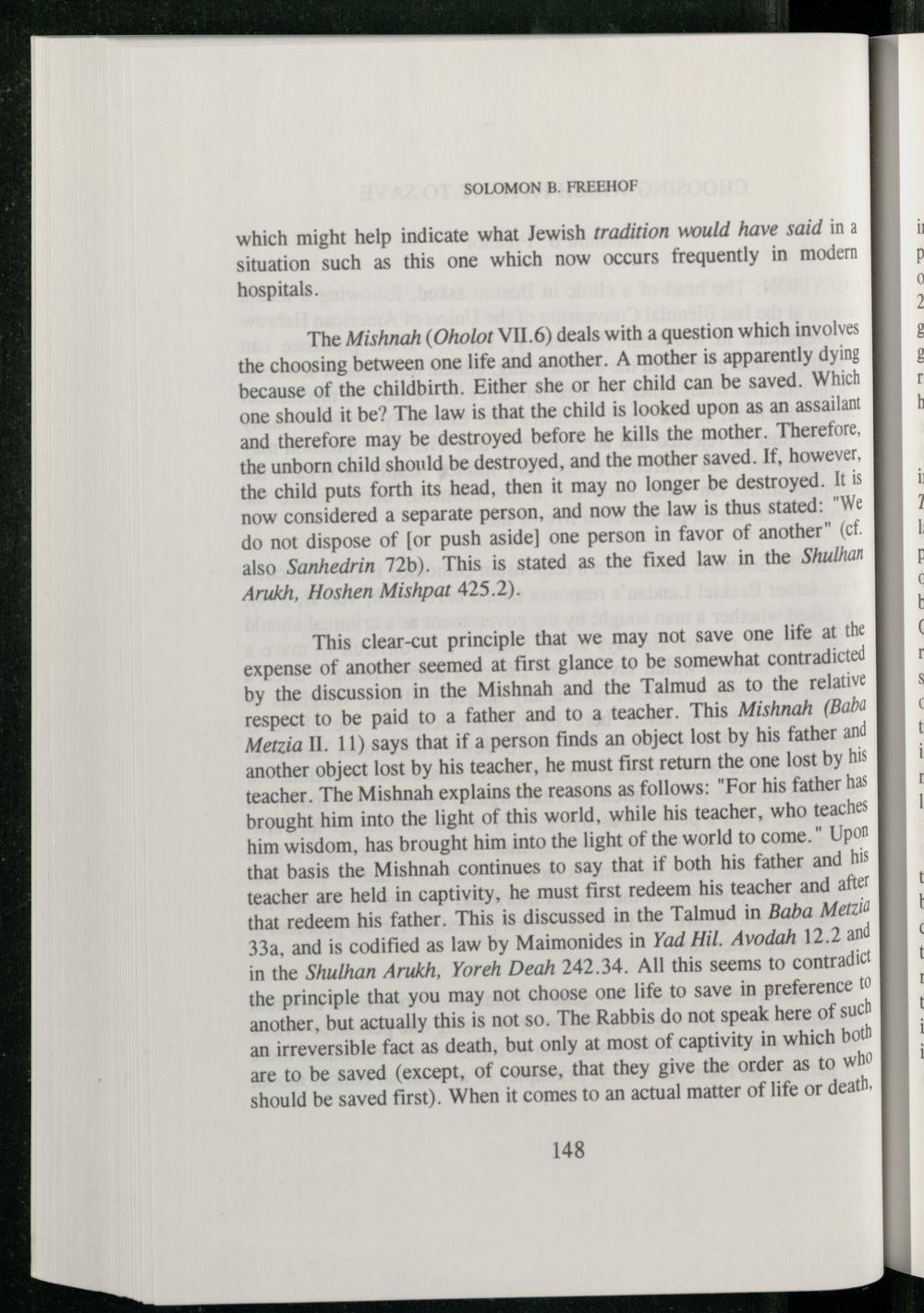 The Mishnah (Oholot VII.6) deals with a question which involves the choosing between one life and another. A mother is apparently dying because of the childbirth. Either she or her child can be saved. Which one should it be? The law is that the child is looked upon as an assailant and therefore may be destroyed before he kills the mother. Therefore, the unborn child should be destroyed, and the mother saved. If, however, the child puts forth its head, then it may no longer be destroyed. It is now considered a separate person, and now the law is thus stated:"We do not dispose of[or push aside] one person in favor of another"(cf. also Sanhedrin 72b). This is stated as the fixed law in the Shulhan Arukh, Hoshen Mishpat 425.2).