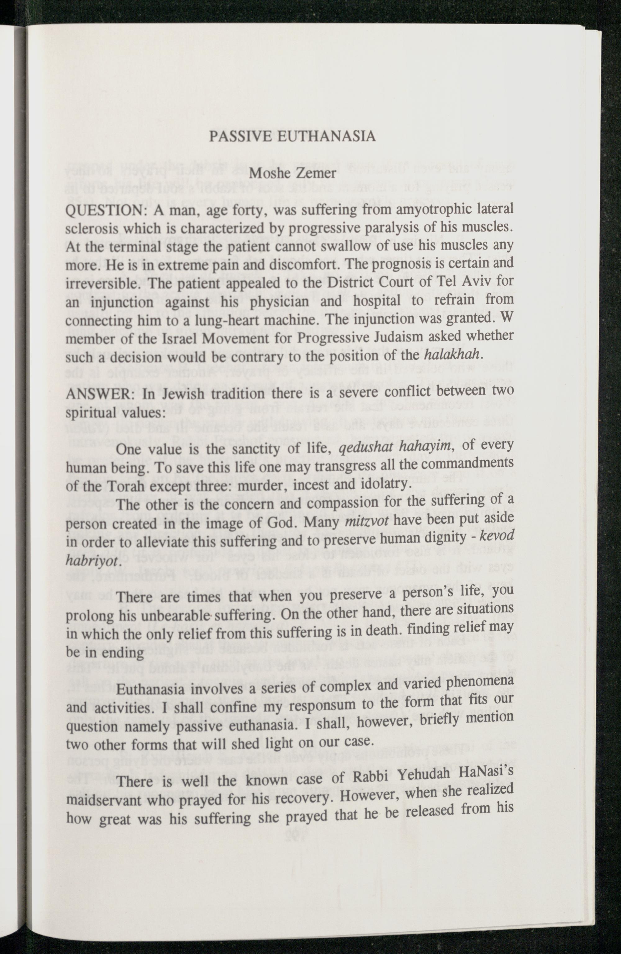 QUESTION: A man, age forty, was suffering from amyotrophic lateral sclerosis which is characterized by progressive paralysis of his muscles. At the terminal stage the patient cannot swallow of use his muscles any more. He is in extreme pain and discomfort. The prognosis is certain and irreversible. The patient appealed to the District Court of Tel Aviv for an injunction against his physician and hospital to refrain from connecting him to a lung-heart machine. The injunction was granted. W member of the Israel Movement for Progressive Judaism asked whether such a decision would be contrary to the position of the halakhah.
