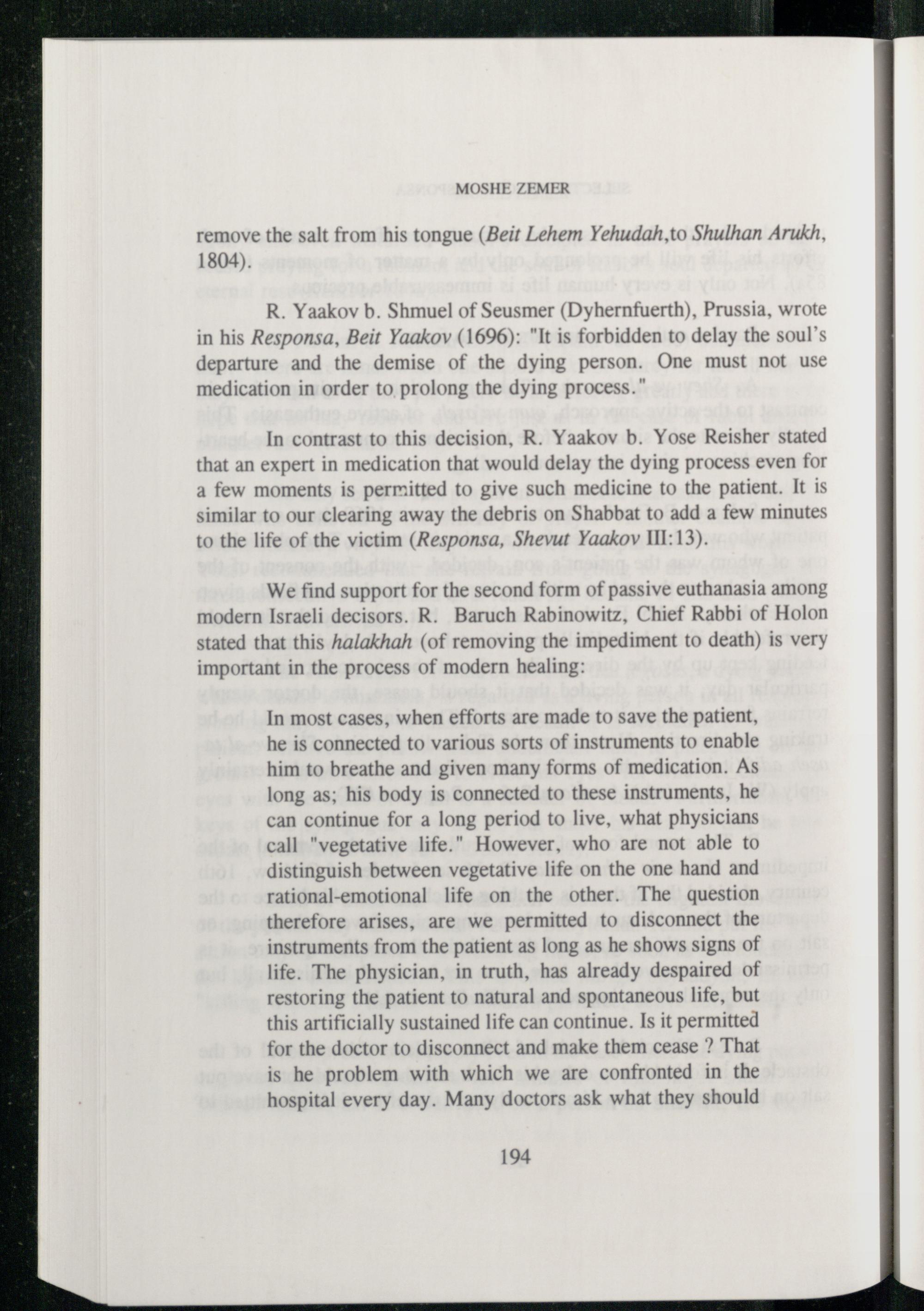 In most cases, when efforts are made to save the patient, he is connected to various sorts of instruments to enable him to breathe and given many forms of medication. As long as; his body is connected to these instruments, he can continue for a long period to live, what physicians call"vegetative life." However, who are not able to distinguish between vegetative life on the one hand and rational-emotional life on the other. The question therefore arises, are we permitted to disconnect the instruments from the patient as long as he shows signs of life. The physician, in truth, has already despaired of restoring the patient to natural and spontaneous life, but this artificially sustained life can continue. Is it permitted for the doctor to disconnect and make them cease? That is he problem with which we are confronted in the hospital every day. Many doctors ask what they should