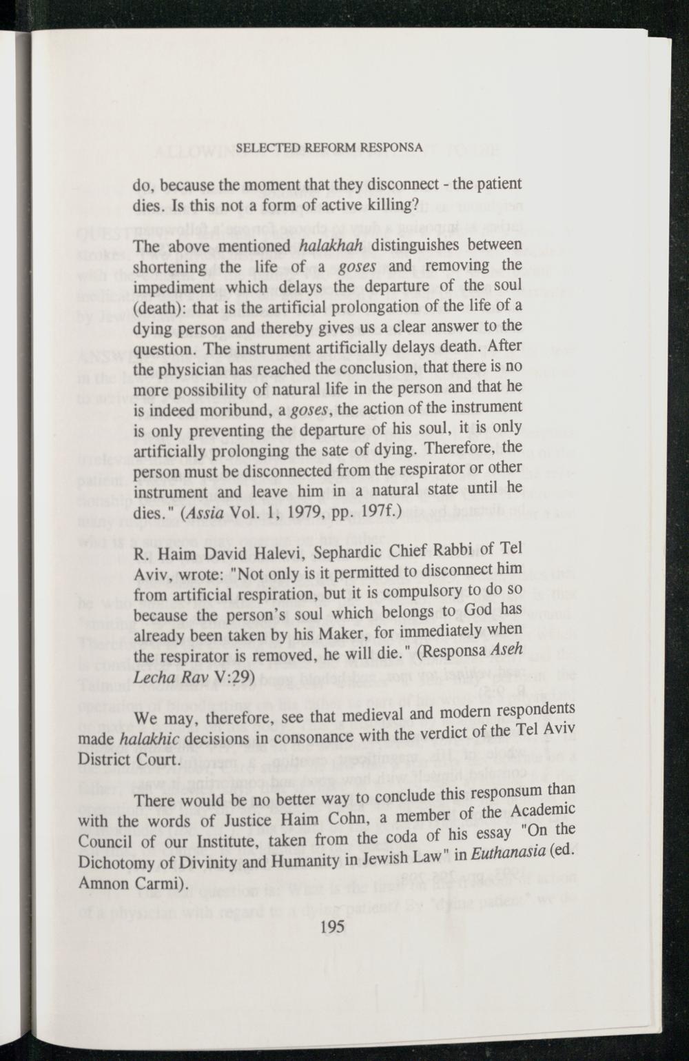 The above mentioned halakhah distinguishes between shortening the life of a goses and removing the impediment which delays the departure of the soul (death): that is the artificial prolongation of the life of a dying person and thereby gives us a clear answer to the question. The instrument artificially delays death. After the physician has reached the conclusion, that there is no more possibility of natural life in the person and that he is indeed moribund, a goses, the action of the instrument is only preventing the departure of his soul, it is only artificially prolonging the sate of dying. Therefore, the person must be disconnected from the respirator or other instrument and leave him in a natural state until he dies."(Assia Vol. 1, 1979, pp. 1971.)
