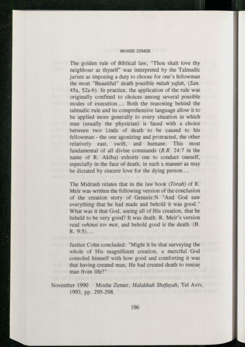 The golden rule of Biblical law,"Thou shalt love thy neighbour as thyself" was interpreted by the Talmudic jurists as imposing a duty to choose for one’s fellowman the most"Beautiful" death possible mitah yafah,(San. 45a, 52a-b). In practice, the application of the rule was originally confined to choices among several possible modes of execution.... Both the reasoning behind the talmudic rule and its comprehensive language allow it to be applied more generally to every situation in which man(usually the physician) is faced with a choice between two kinds of death to be caused to his fellowman- the one agonizing and protracted, the other relatively east, swift, and humane. This most fundamental of all divine commands(B.R. 24:7 in the name of R. Akiba) exhorts one to conduct oneself, especially in the face of death, in such a manner as may be dictated by sincere love for the dying person....